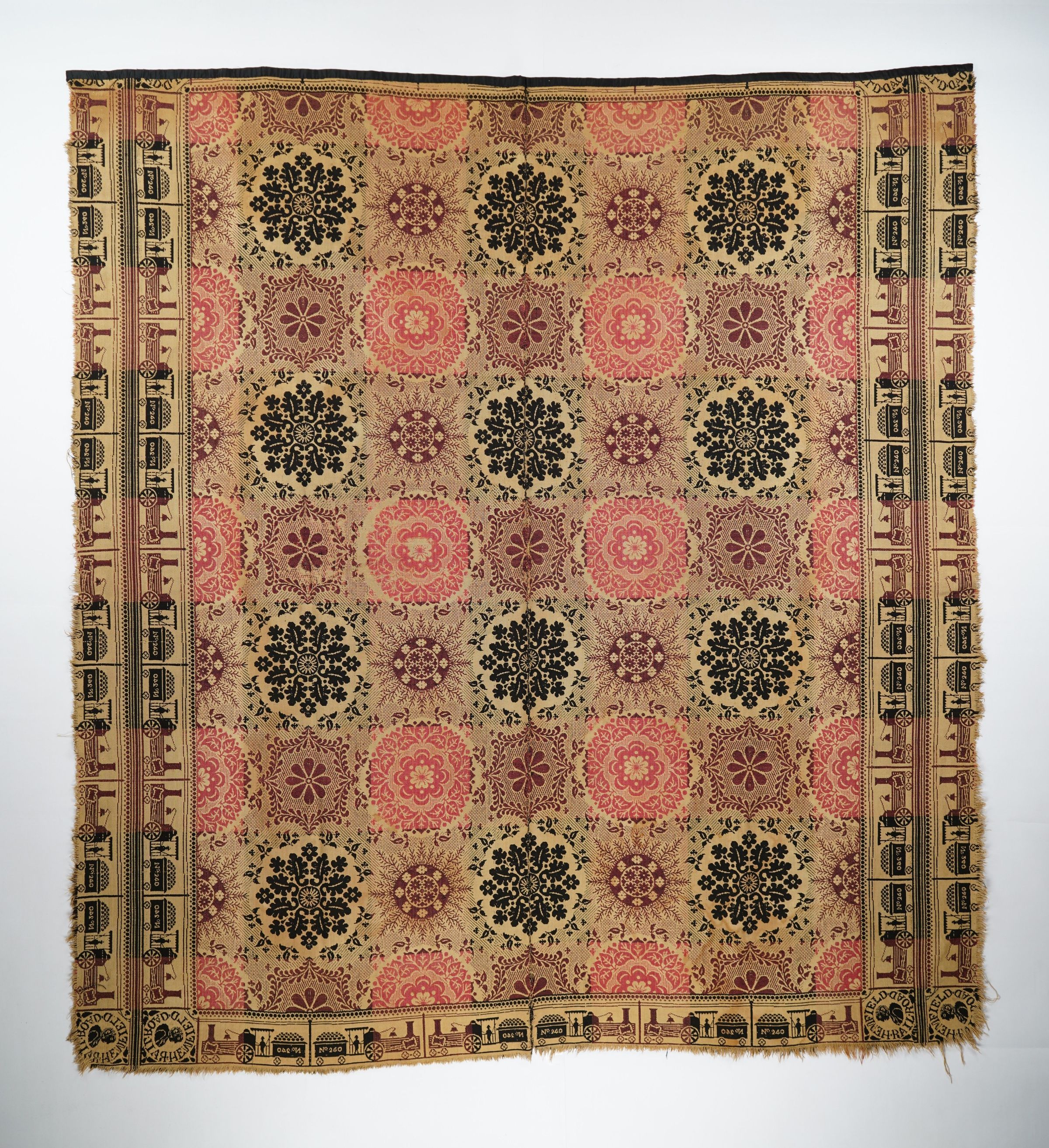 Figured and fancy doubleweave coverlet with borders on 4 sides and self-fringe on sides and bottom. Two panels joined by a center seam. Navy and red wool with undyed cotton. Leafy medallions centerfield pattern; train border on all sides. Unknown weaver with "Hempfield Railroad" cornerblock.Context