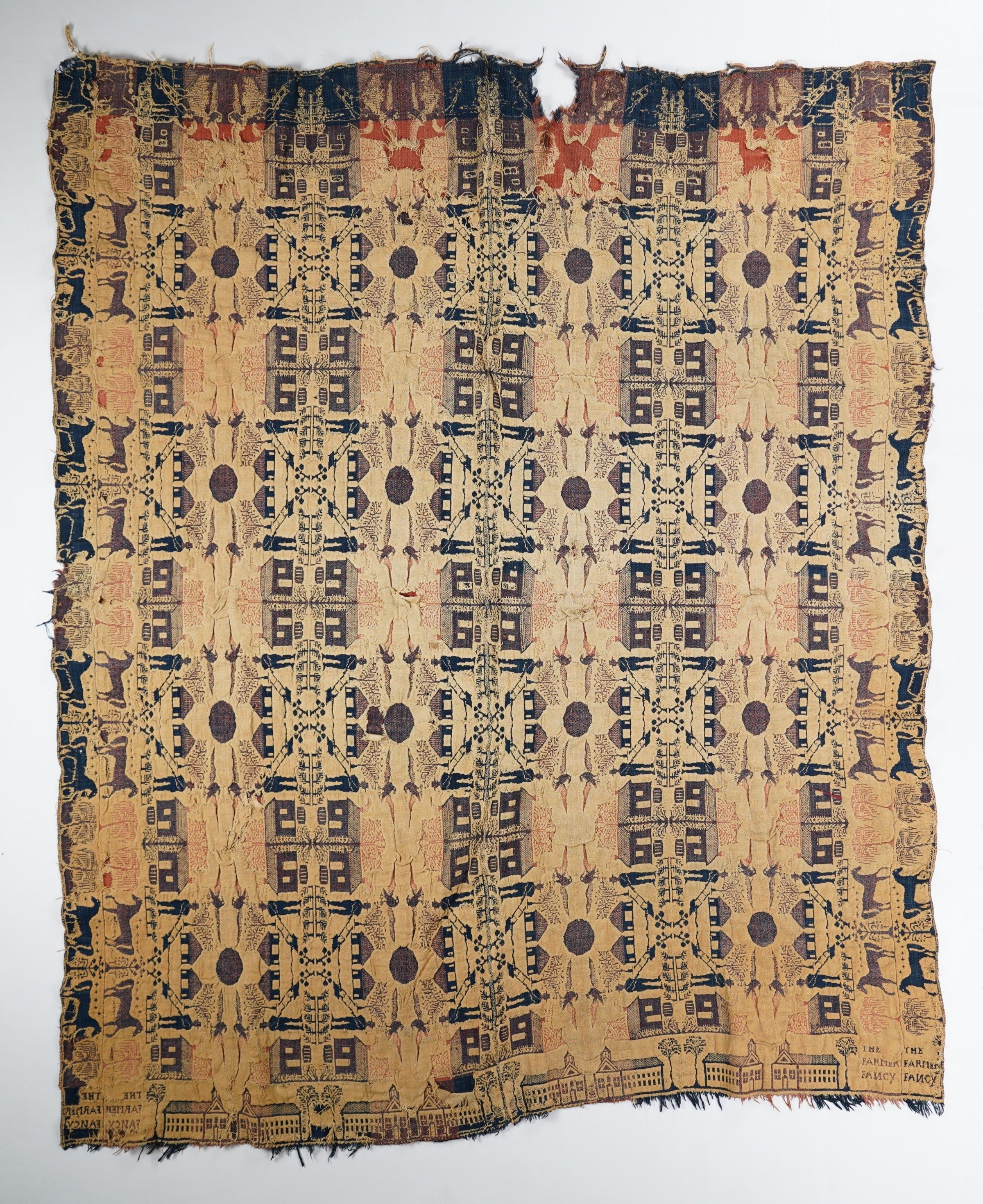 Figured and fancy doubleweave coverlet with borders on 3 sides and self fringe on 2 sides. Two panels joined by a center seam. Blue and red wool with undyed cotton. Farming and eagle centerfield pattern; horse border on sides; plantation building border on bottom. Woven by unknown weaver.Context