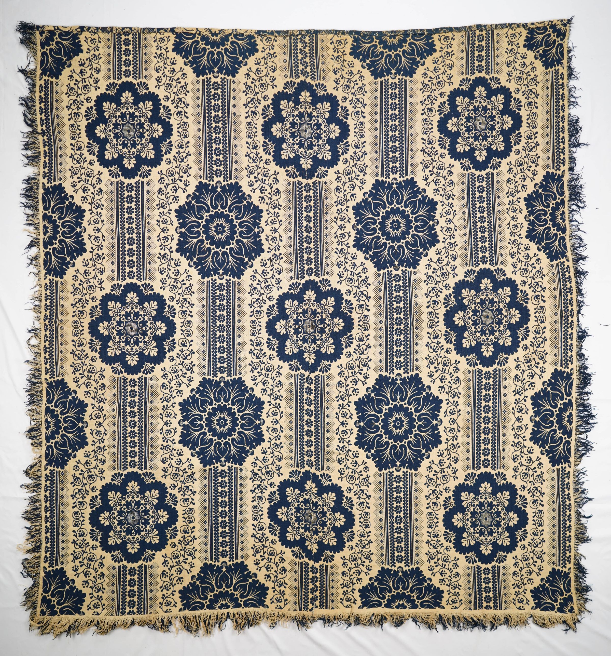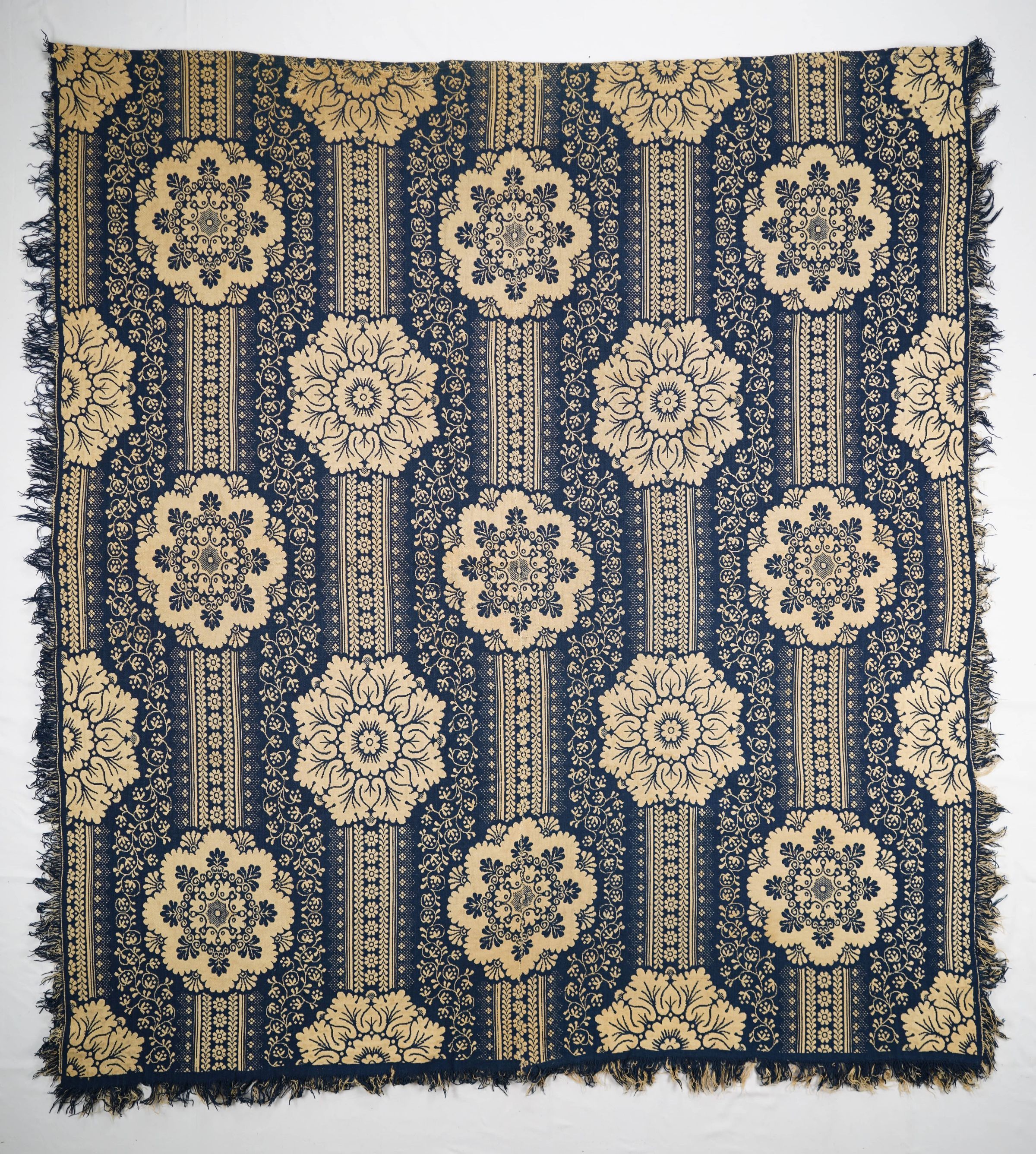Navy and natural figured double weave coverlet; two panels joined by a center seam. Fringe on three sides.