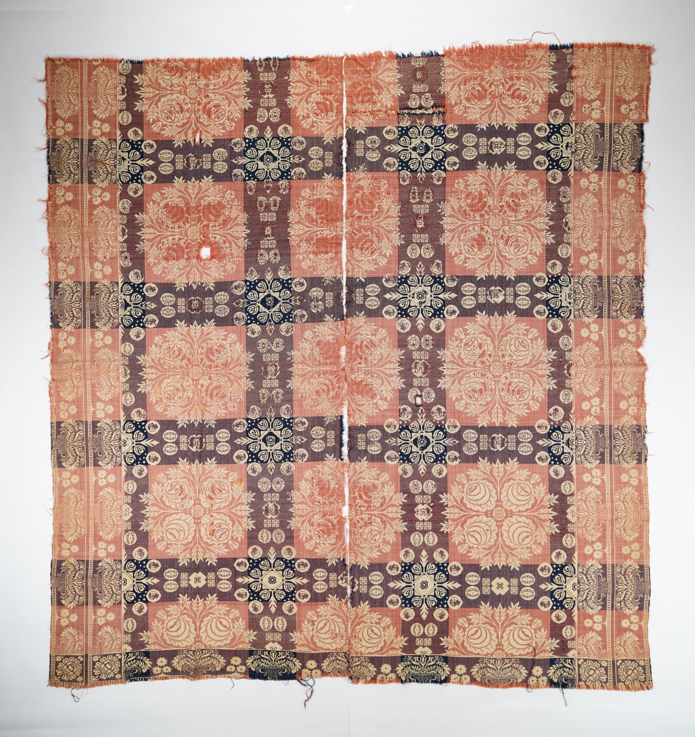 Figured doubleweave coverlet with borders on three sides and no extant fringe. Two separate panels. Navy and red wool with undyed cotton. Floral medallion centerfield pattern with portraits of abolitionists; double leafy border on sides; single leafy border on bottom. Doubled floral cornerblock by unknown weaver.Context