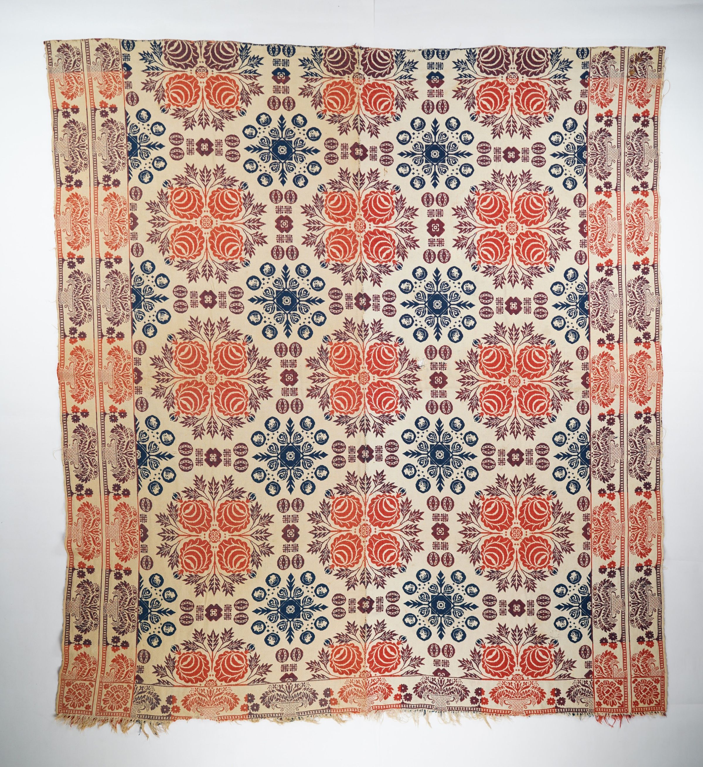 Figured doubleweave coverlet with borders on three sides and remnants of self-fringe on bottom. Two panels joined by a center seam. Red and navy wool with undyed cotton. Little heads (abolitionist silhouettes) surround floral medallions in the centerfield pattern; double urn border on sides; single urn border on bottom. Doubled floral cornerblock used by unknown weaver.Context