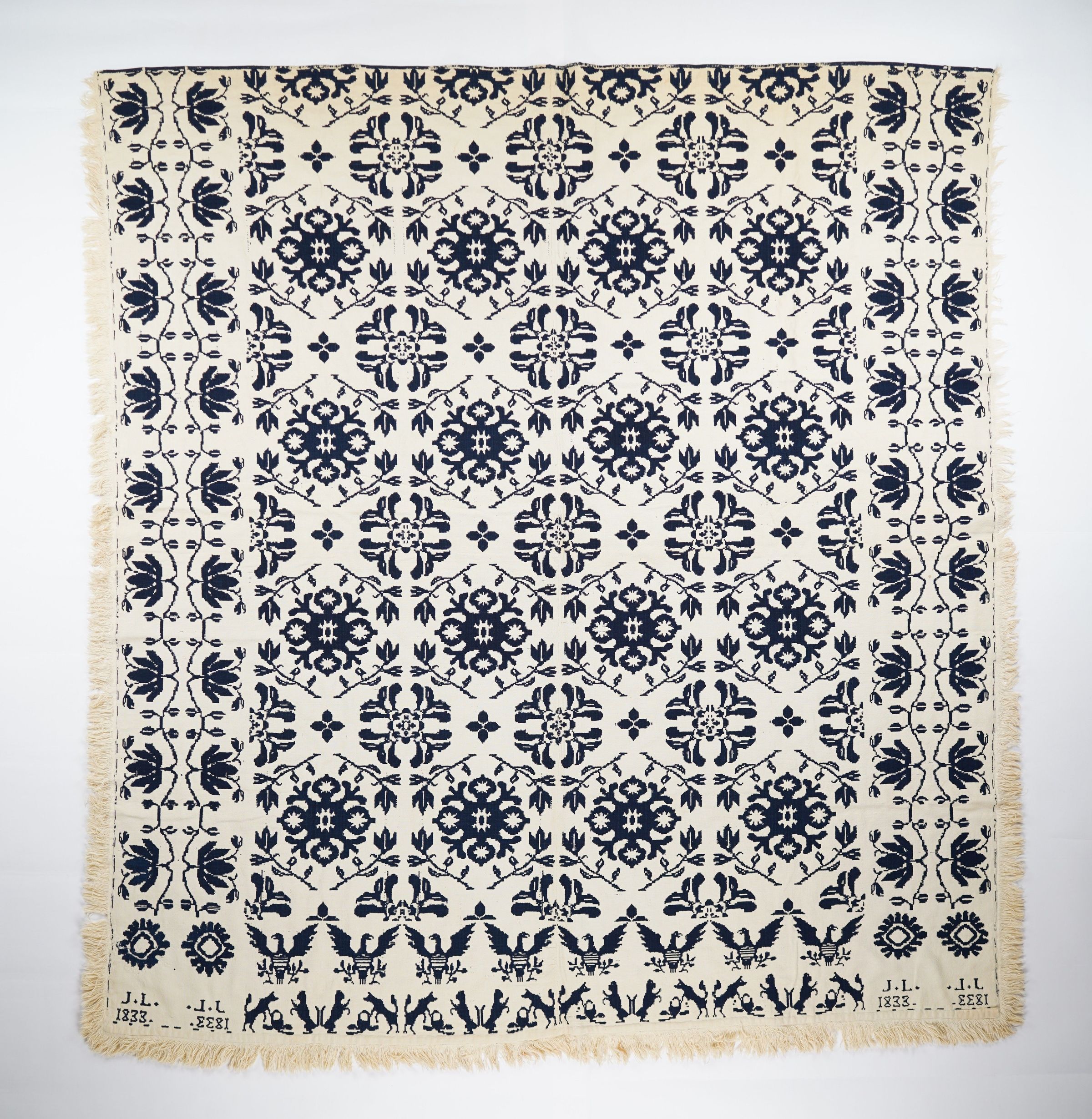 Navy and natural figured doubleweave coverlet with border and applied fringe on three sides. Two joined panels. Woven in 1838 by or for J. L.Context
