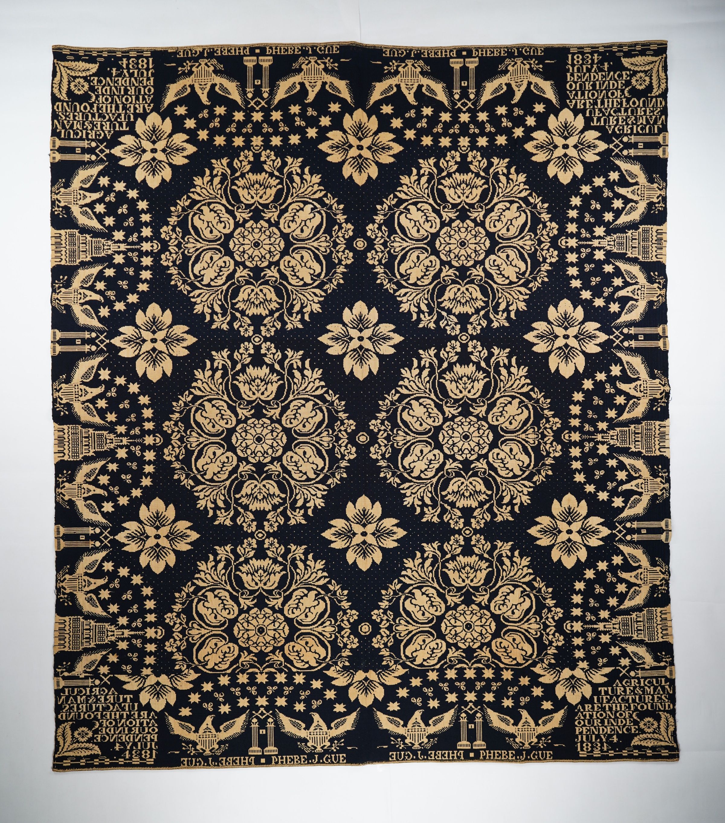 Figured and fancy doubleweave coverlet with borders on 4 sides and no fringe. Woven full-width; seamless. Navy wool with undyed cotton. Floral medallion centerfield pattern; patriotic eagle border on all sides. Unknown weaver for Phebe J. Gue in 1834 with "Agriculture & Manufactures" trademark.Context