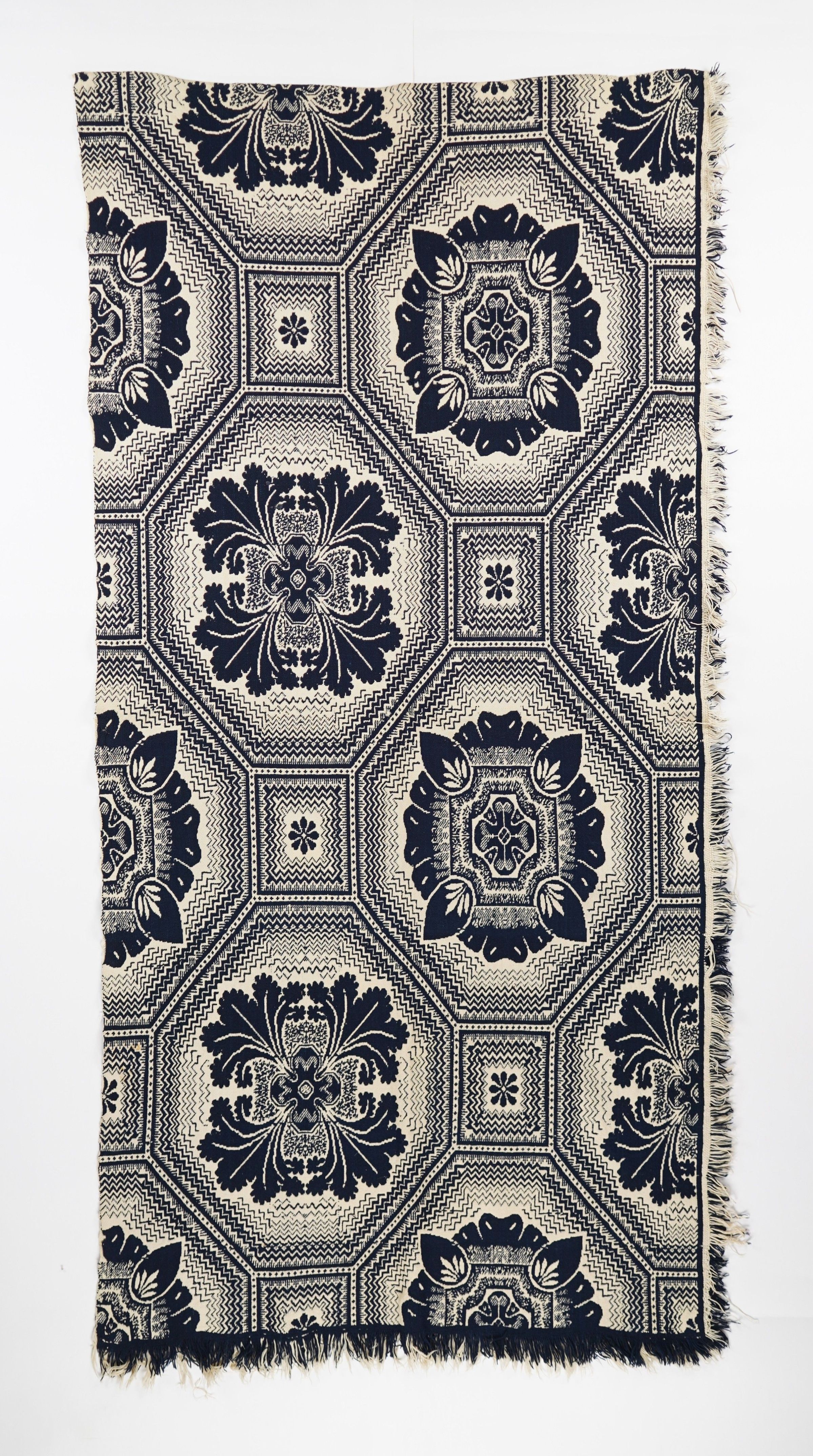 Natural and navy figured doubleweave coverlet with self-fringe on two sides. One panel.Context