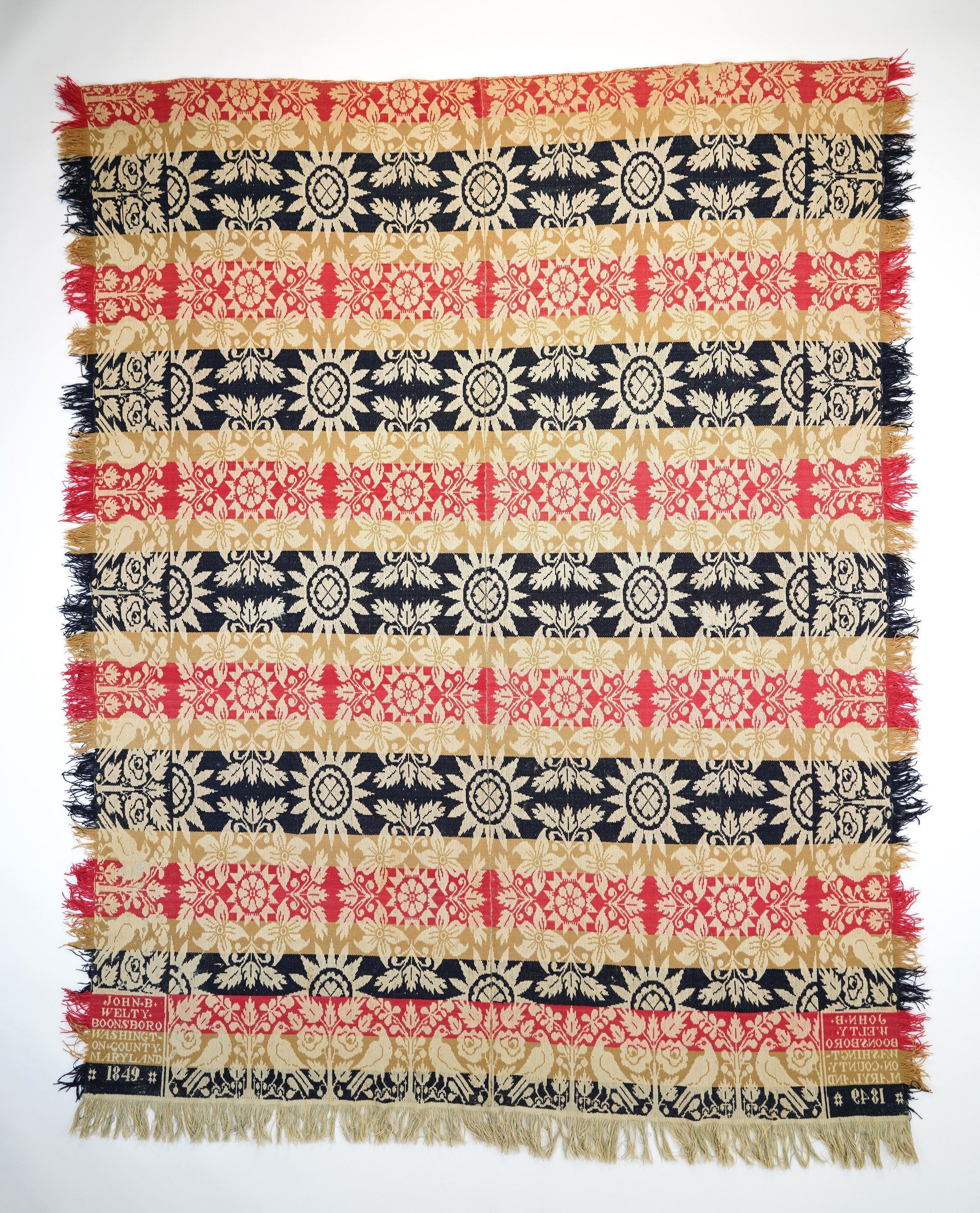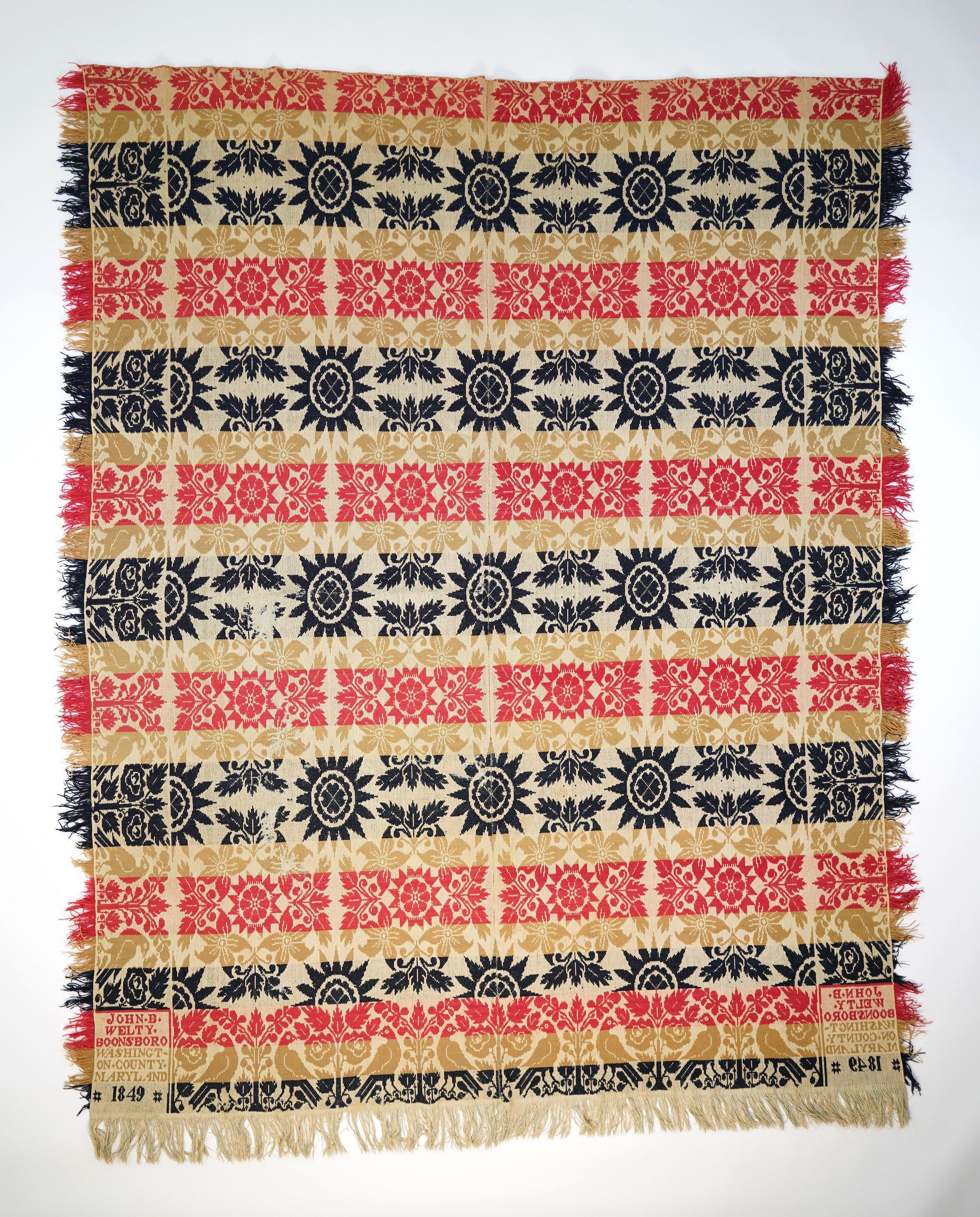 Red, Navy, Brown and White Jacquard Coverlet woven in Boonsboro, Maryland in 1849. Two panels joined by a center seam with self-fringe on three sides. Centerfield pattern with geometric starbursts and Lilies of France motif, and border with distelfinks and foliage; 69" x 89”.