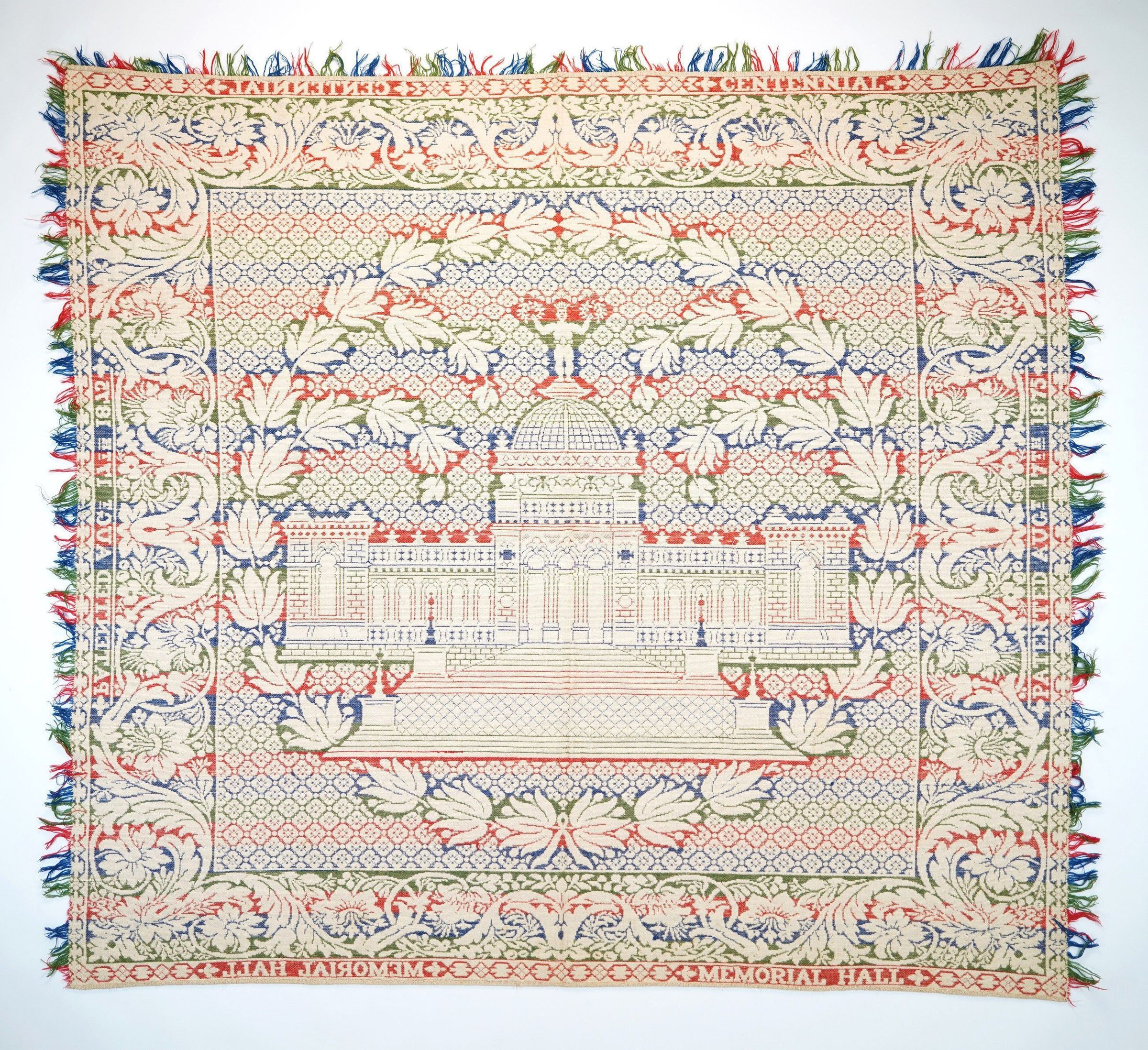 Centennial 1876 Jacquard Coverlet. Patented 17 August 1875 and also inscribed “Memorial Hall.” Power woven with full loom width, doubleweave. Cotton with wool weft in red, green and blue. Has a leaf vine and pendant flower borders with memorial hall in the middle; 84 x 81”.