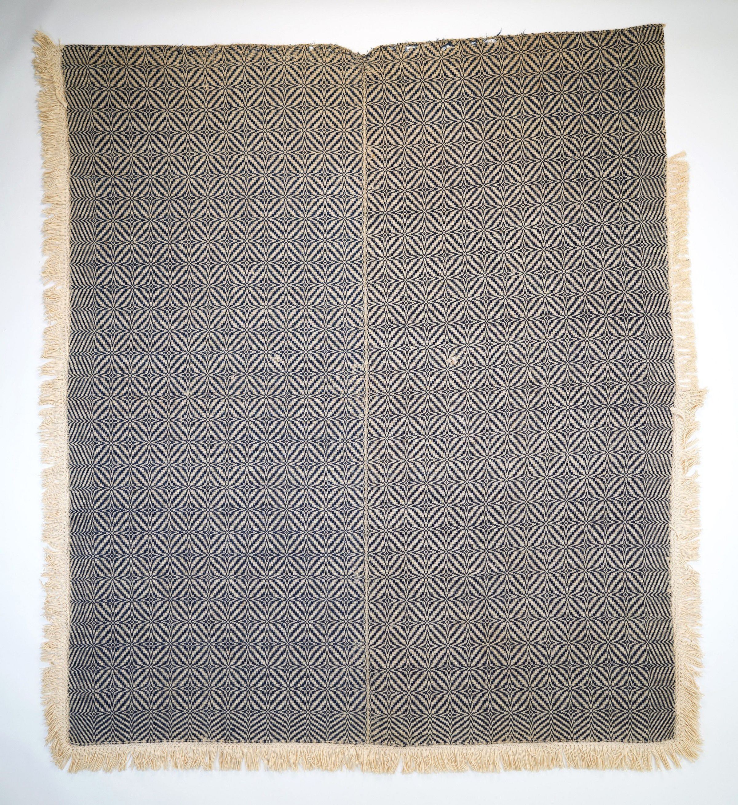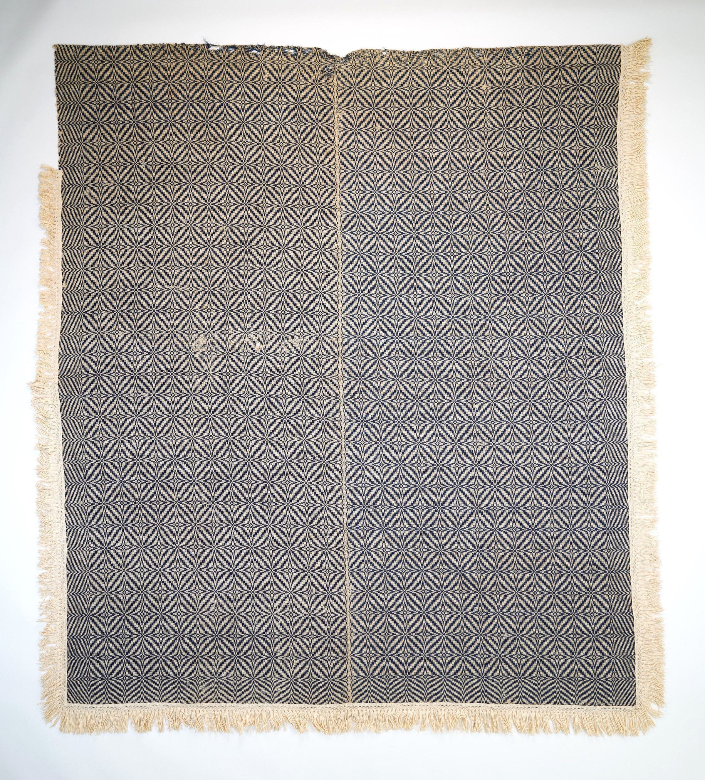 Navy and natural overshot coverlet with applied knotted fringe, part of which is missing from the bottom border. Two panels joined by a center seam; 75 x 87”. Pattern is a version of 'Star of Bethlehem' with straight draw orders.