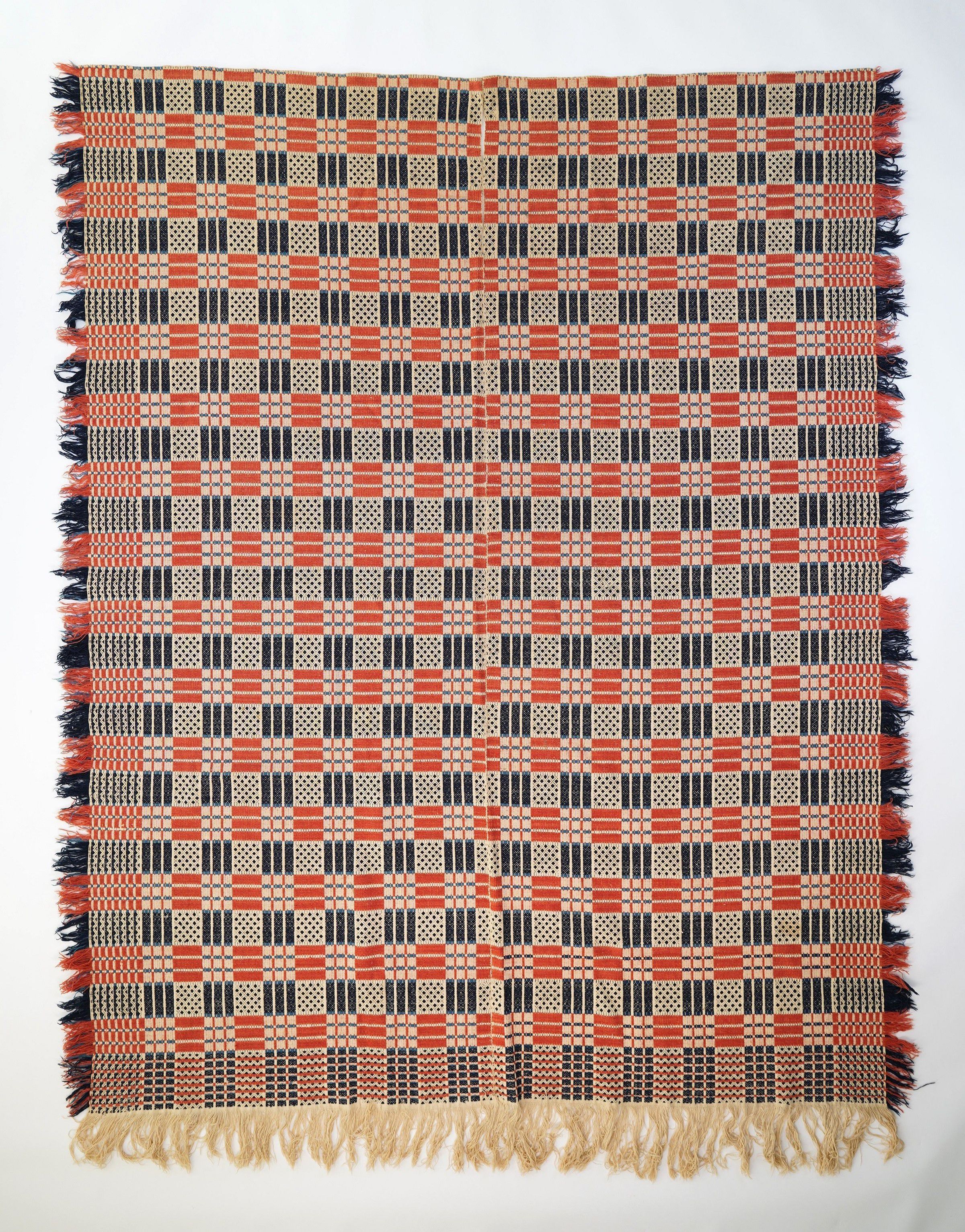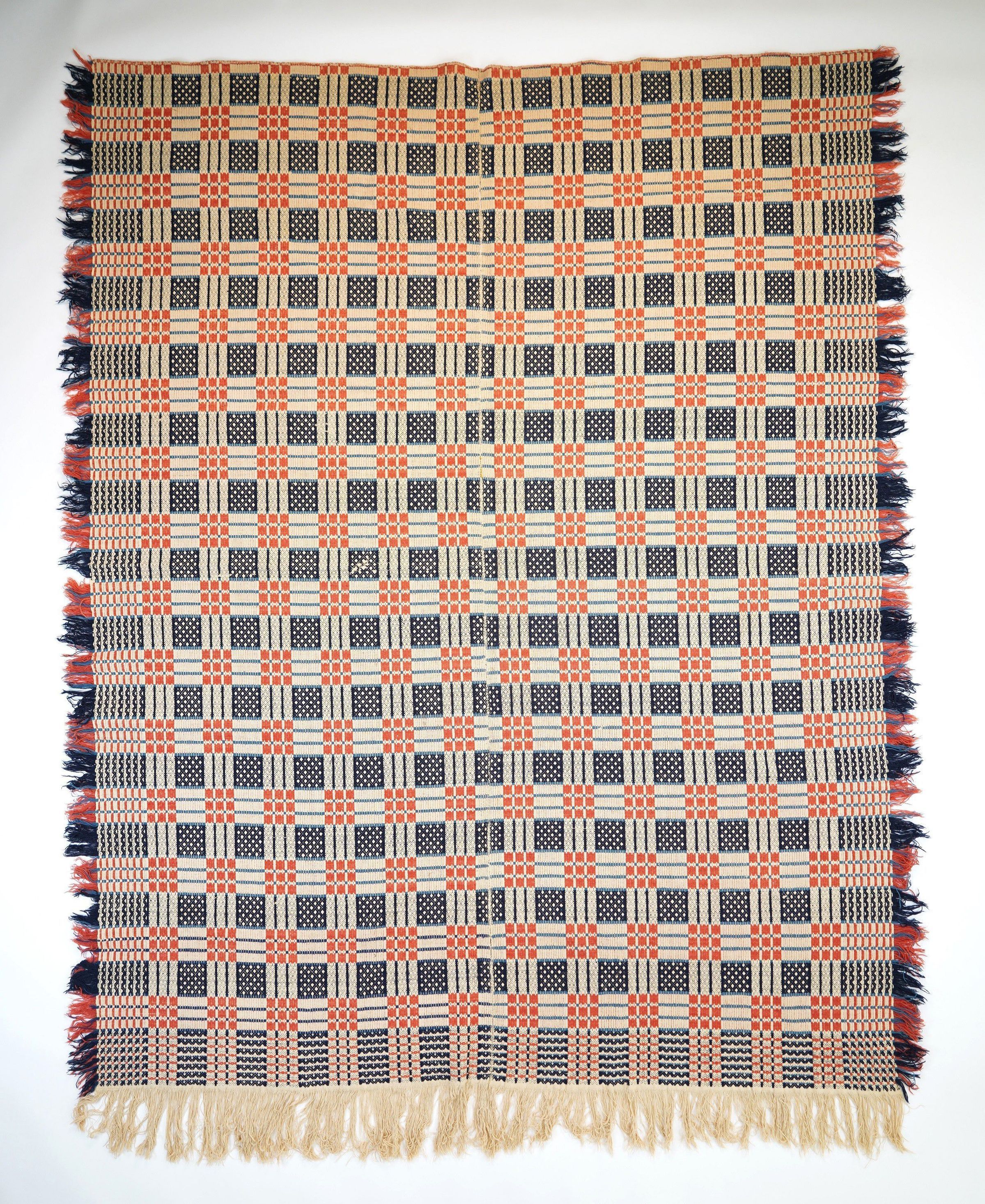 Navy, Burnt Sienna & Prussian Blue Coverlet with two panels and good fringe; multi-shaft point twill coverlet with “checkerboard" or "window pane" pattern squares; 71" x 93". Circa 1825-1830.