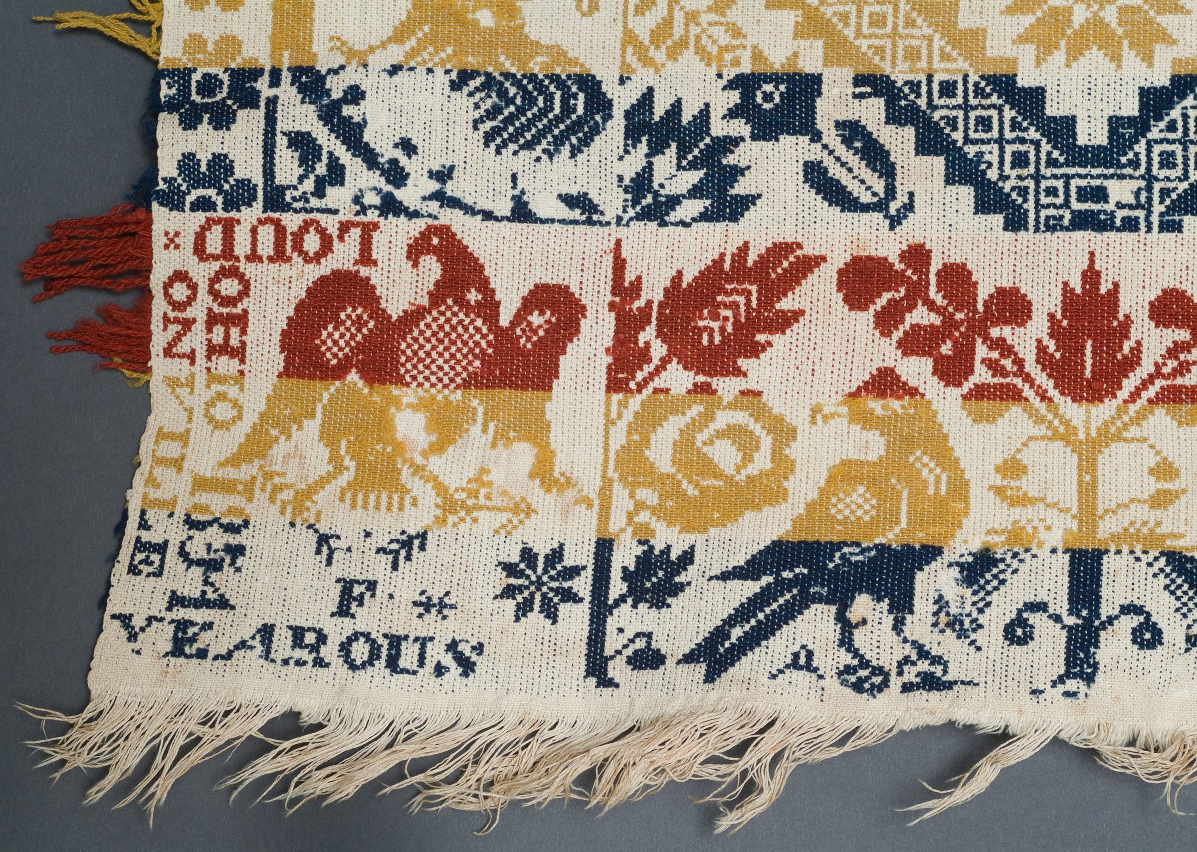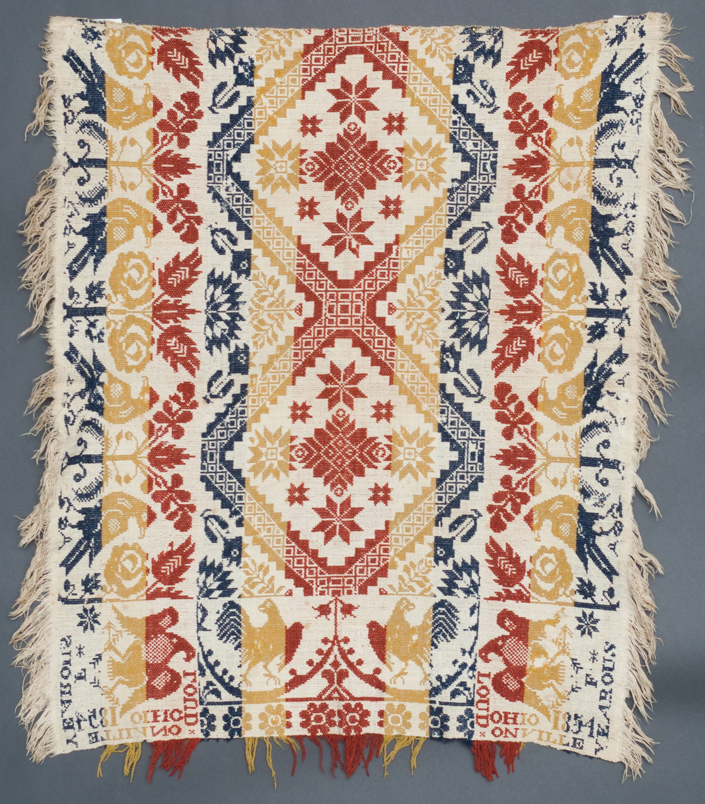 single weave; navy, gold, red, natural; geometric star; bird and floral border; signature corner blocks with eagles; fringe on 3 sides; crib or sample sizeCollection