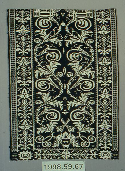 Figured coverlet sample; undyed cotton and black wool, double cloth. Selvedges on either side; hemmed top and bottom. Central motif consists of a chain of scrolls and vines. At the top edge there is the beginnings of a building. A stylized floral pattern serves as the bottom border and continues along the inner portion of the side borders. The outermost border on the sides has a ladder design. A single highly stylized floral motif is in the lowest corners.Collection