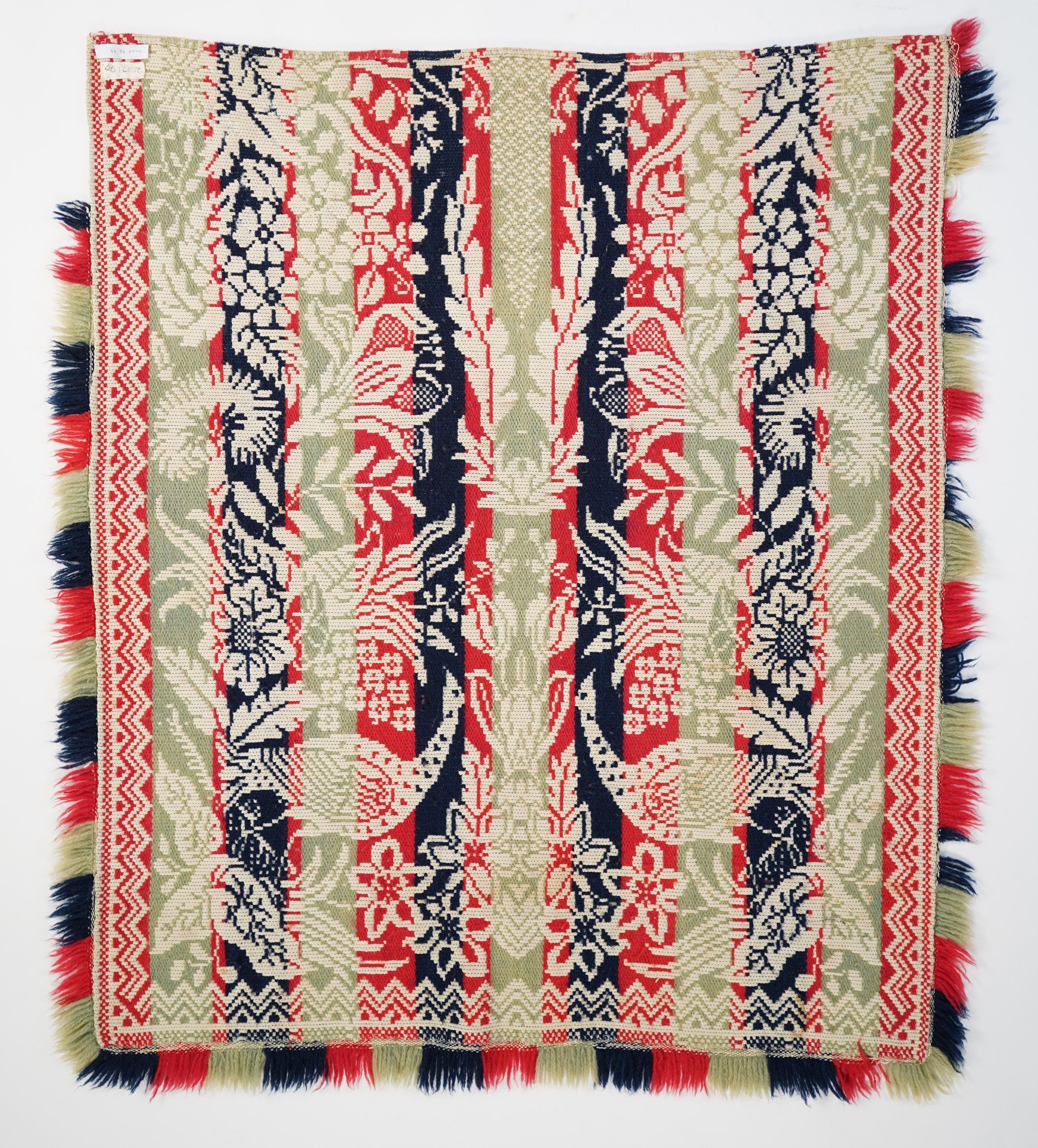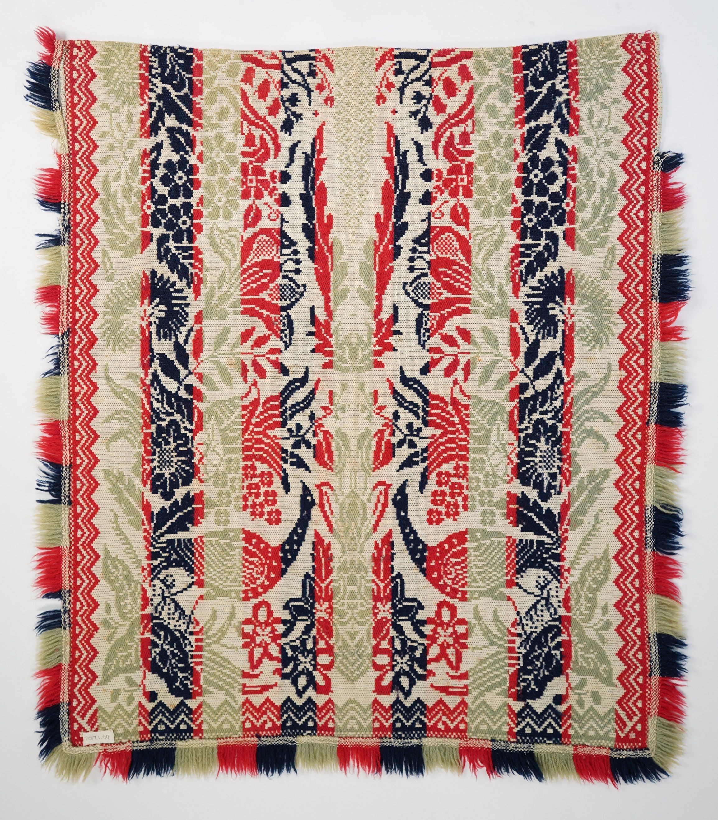 Figured coverlet, undyed and blue cotton and blue, red, and green worsted, tied double cloth (Beiderwand). Coverlet is believed to be for a crib. All four sides are hemmed with fringe applied to bottom and sides. Some fringe is missing on top left corner. Top seam is hemmed in opposite direction than other three sides. Central motif consists of two vertical patterned stripes, each containing a goose and floral motifs. Border on bottom and sides is in a zigzag pattern.Collection