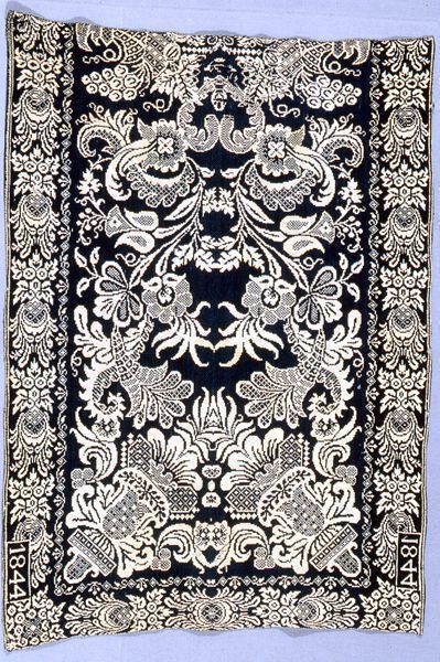 Figured coverlet sample; undyed cotton and blue wool, double cloth. Selvedges on either side; hemmed top and bottom. Central motif consists of floral and scroll motifs. Borders are also in a floral and scroll design, with a narrow scroll framing the upper edge of the border.Collection