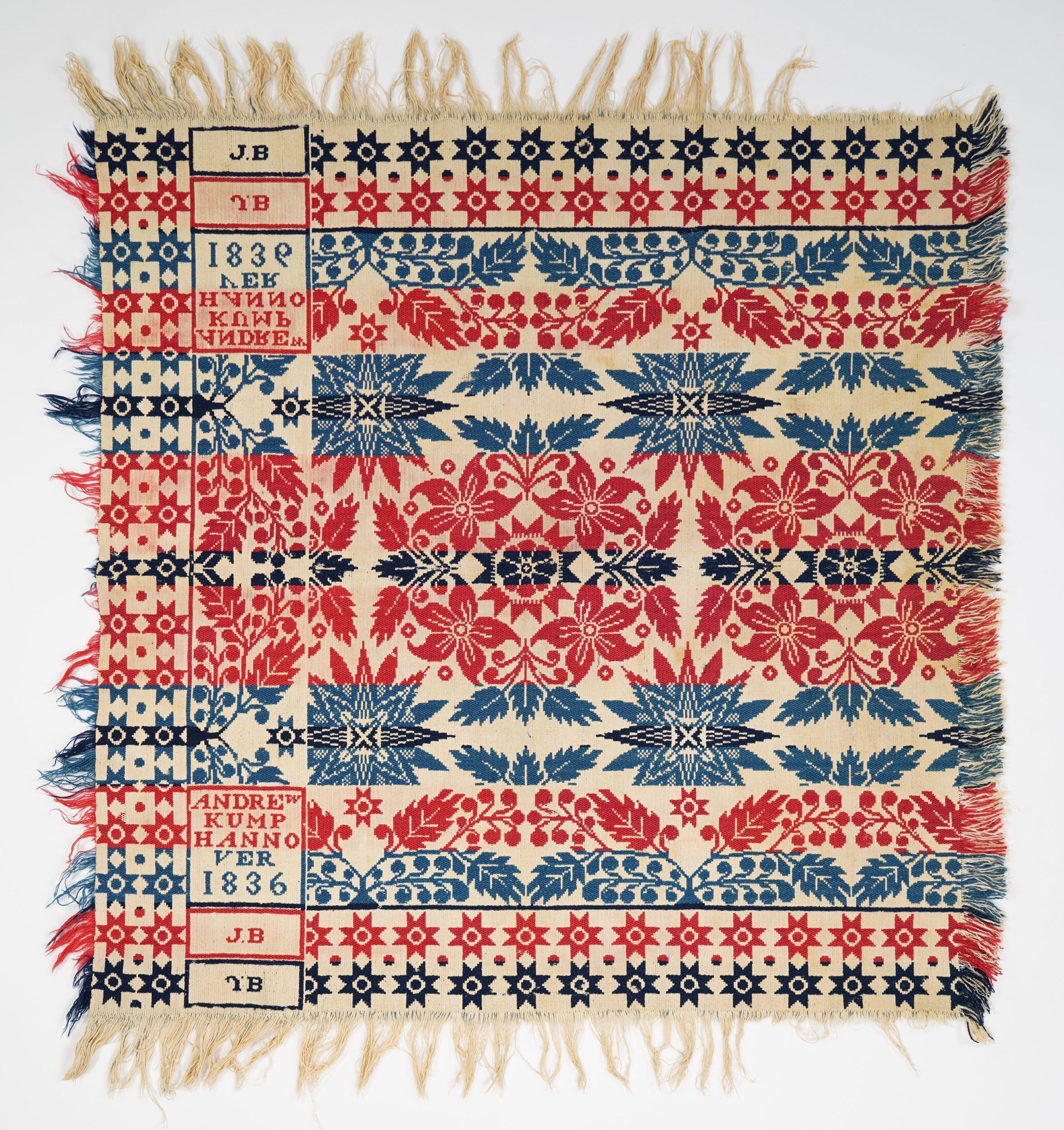 Red, navy, blue, natural figured tied Beiderwand crib size coverlet; self-fringe on three sides; unfinished top edge; grapevine border on three sides; four lilies and starburst centerfield pattern.Collection