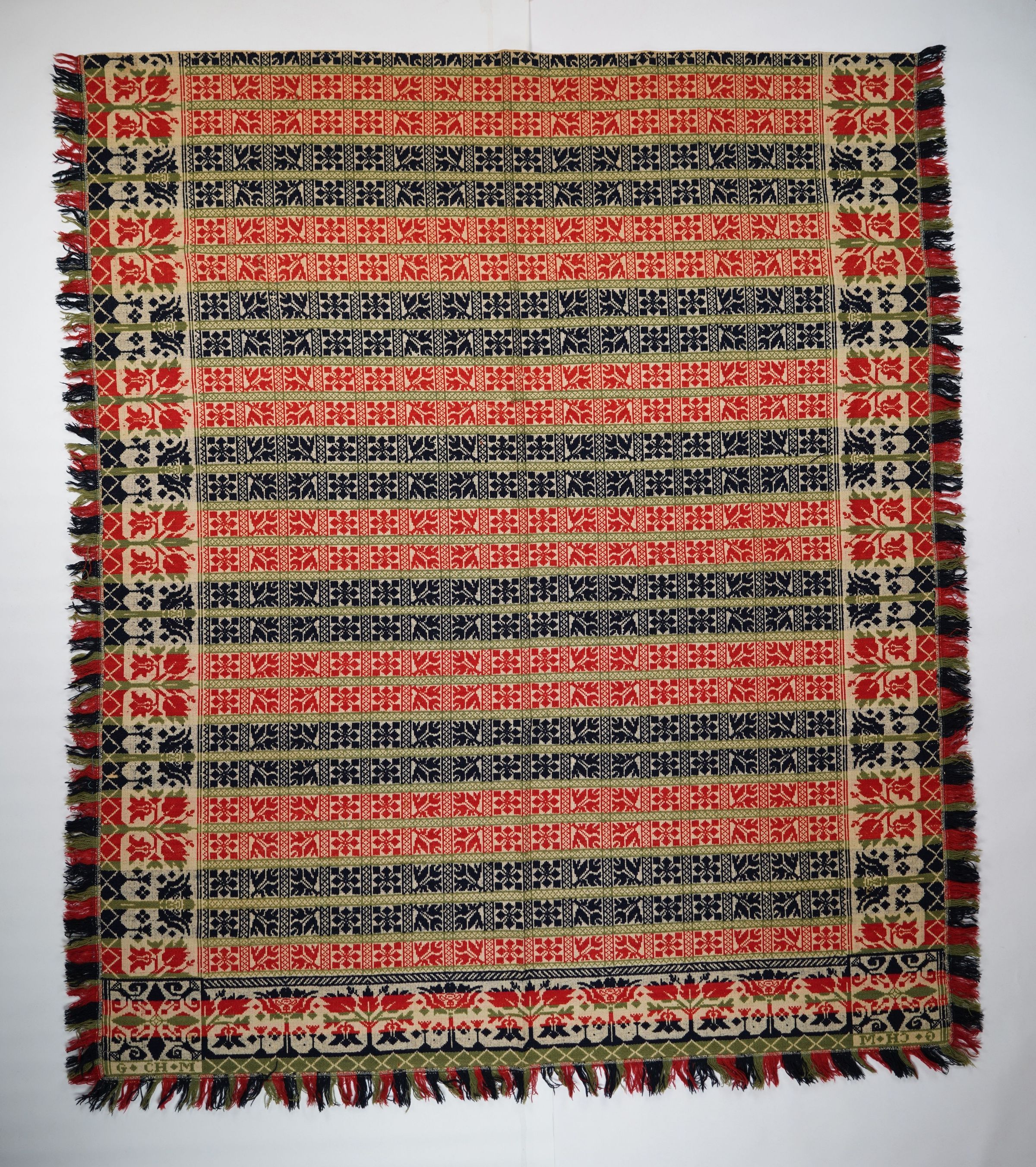 Green, red, navy, and natural figured tied half doublecloth coverlet with border and applied fringe on three sides. Two joined panels.Collection
