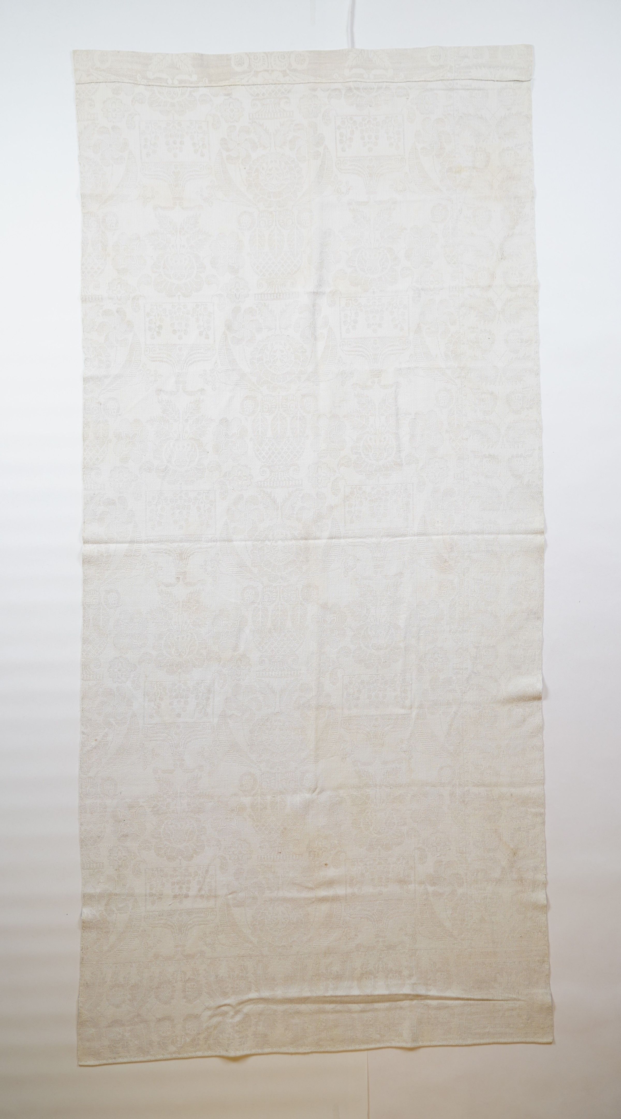 White and natural figured coverlet with border along bottom. One panel.