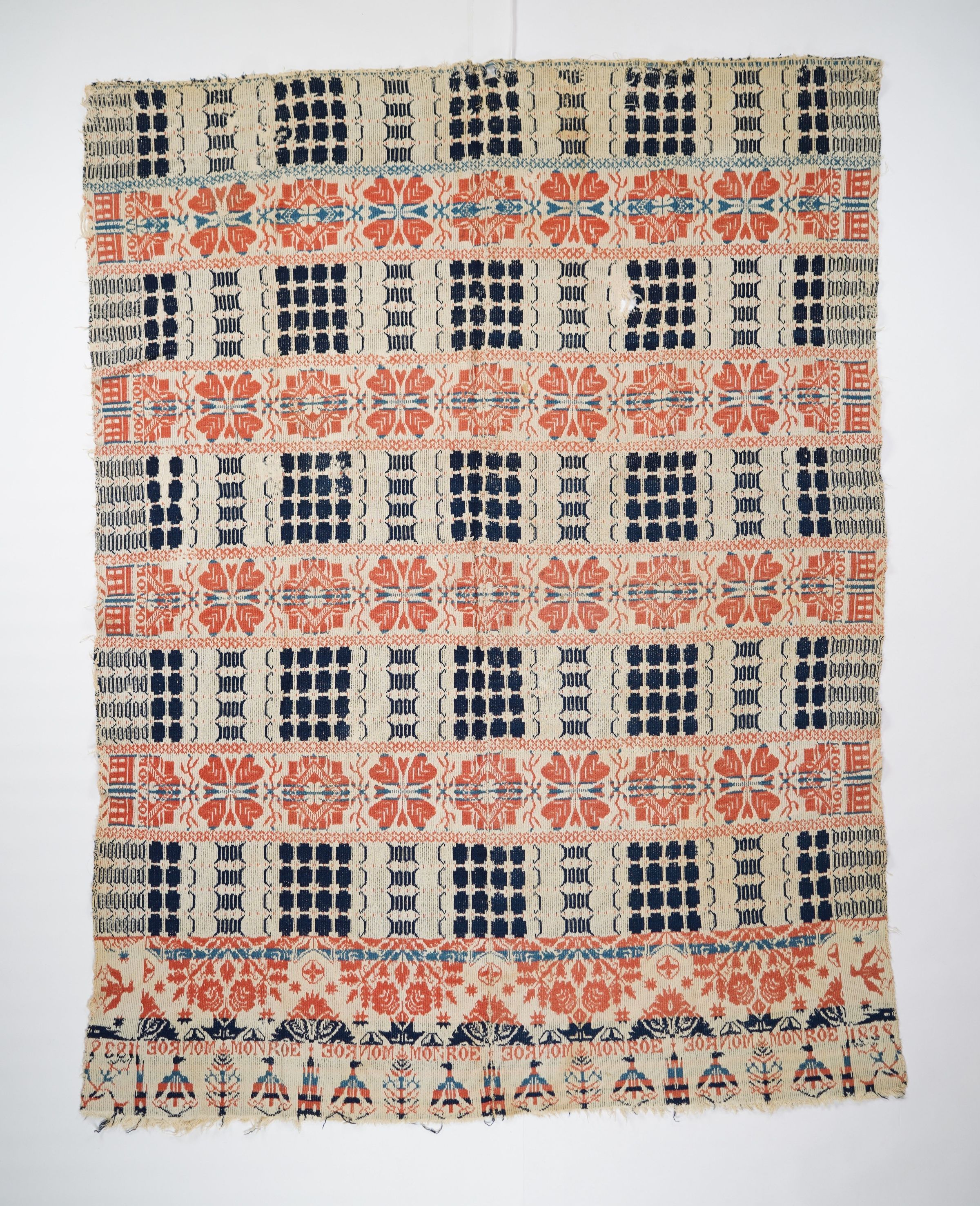 Blue, navy, red, and natural figured tied half doublecloth coverlet with border on three sides. Two joined panels. Woven in 1838.Collection