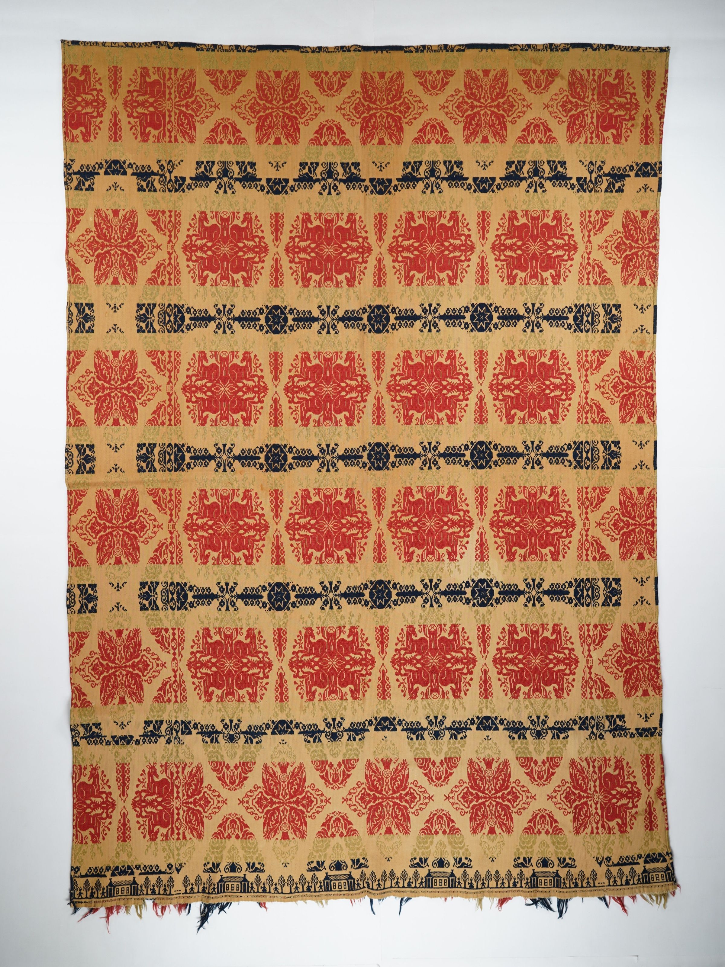 Figured and fancy tied beiderwand coverlet with borders on 1 side and applied fringe on bottom]. Woven full-width; seamless. Navy, red, and light green wool with undyed cotton. Deer medallions centerfield pattern; Houses and people border on bottom. Unknown weaver.Context