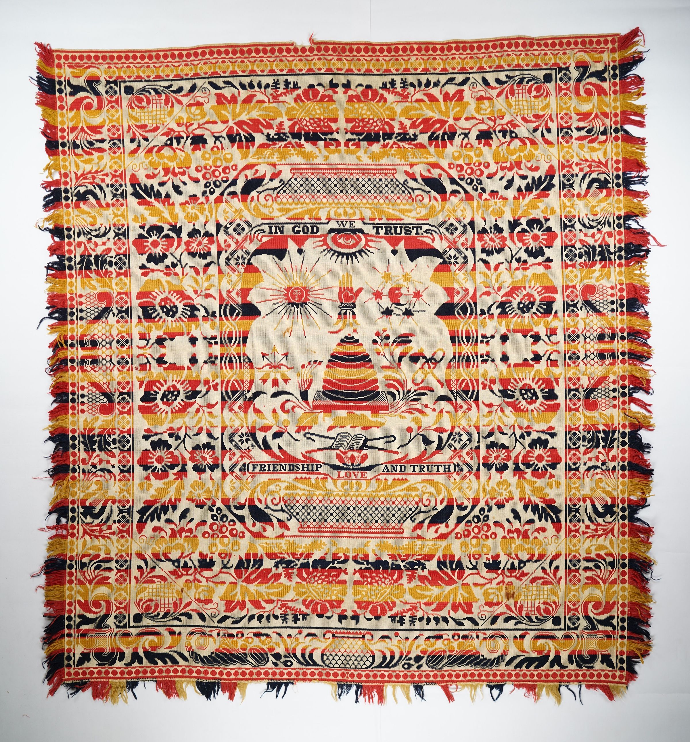 Figured and fancy tied beiderwand coverlet with borders on 3 sides and self-fringe on sides and applied fringe on bottom. Woven full-width; seamless. Navy, red, and gold wool with undyed cotton. Masonic symbols centerfield pattern; abstract border on sides and bottom. Unknown weaver.Context