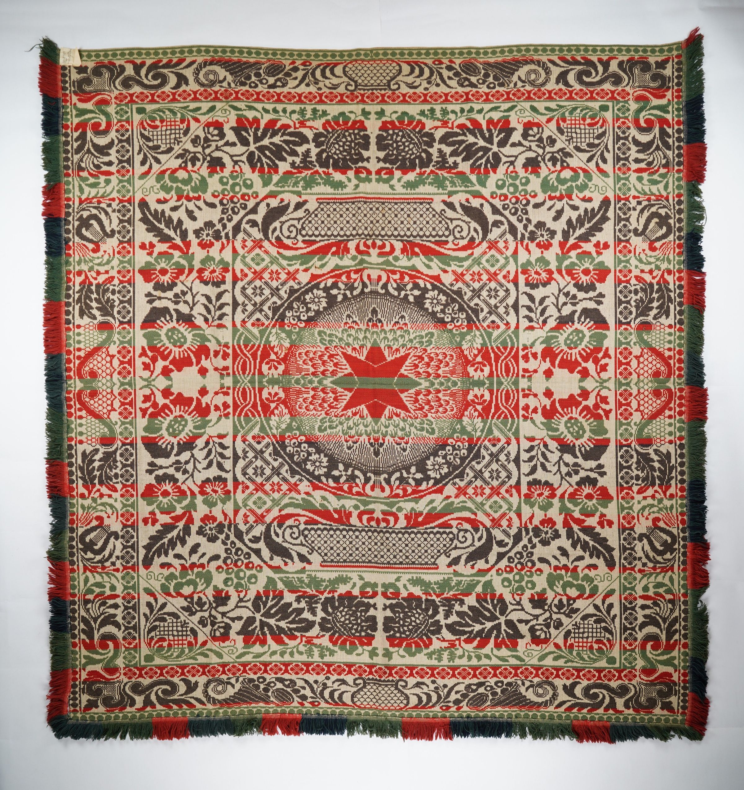 Brown, green, red, and natural figured tied beiderwand center medallion coverlet with applied fringe on three sides. Seamless.Context