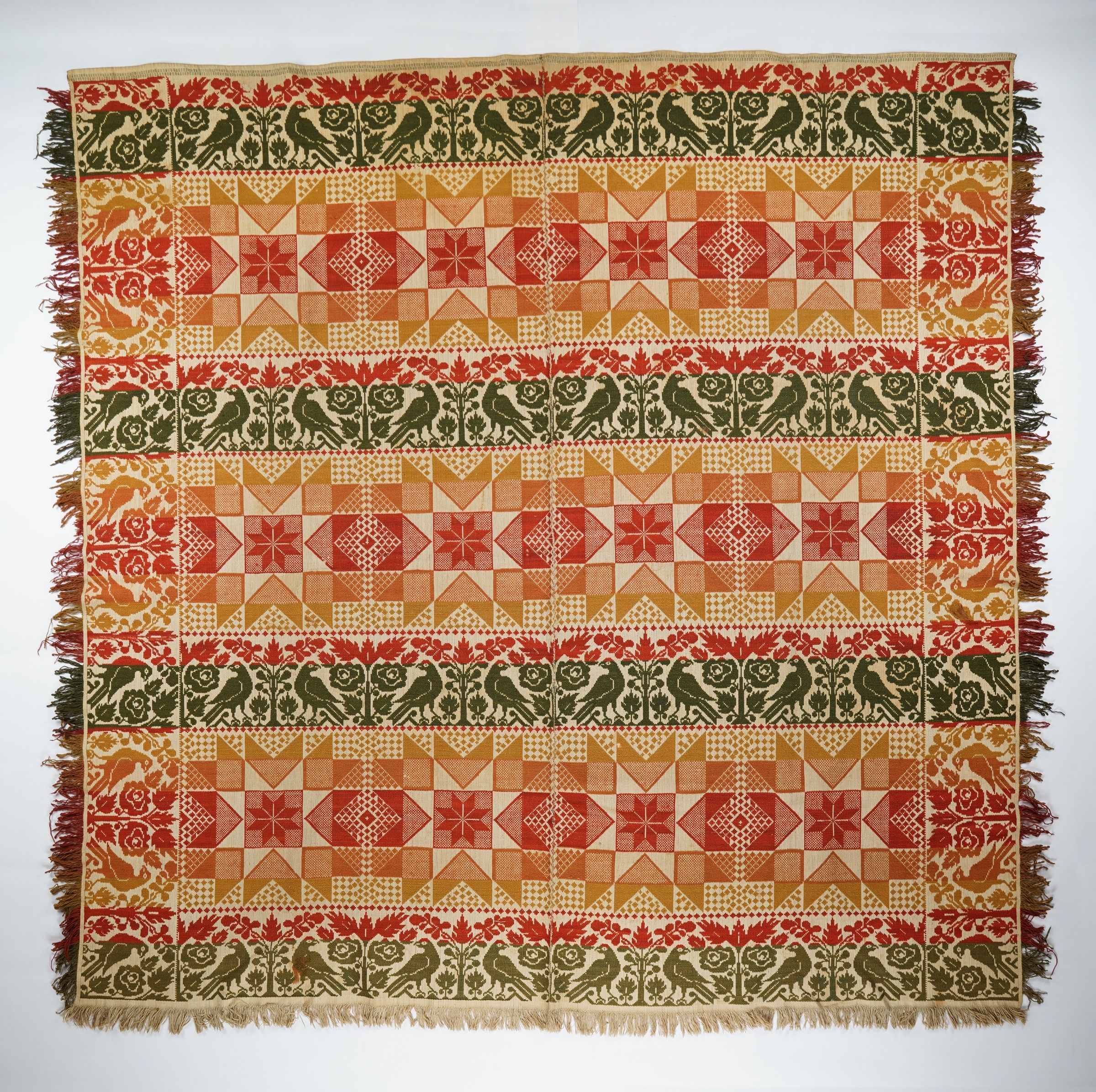 Red, Orange, Yellow, Green, and natural figured tied beiderwand coverlet with border and self-fringe on three sides. Two joined panels.Context