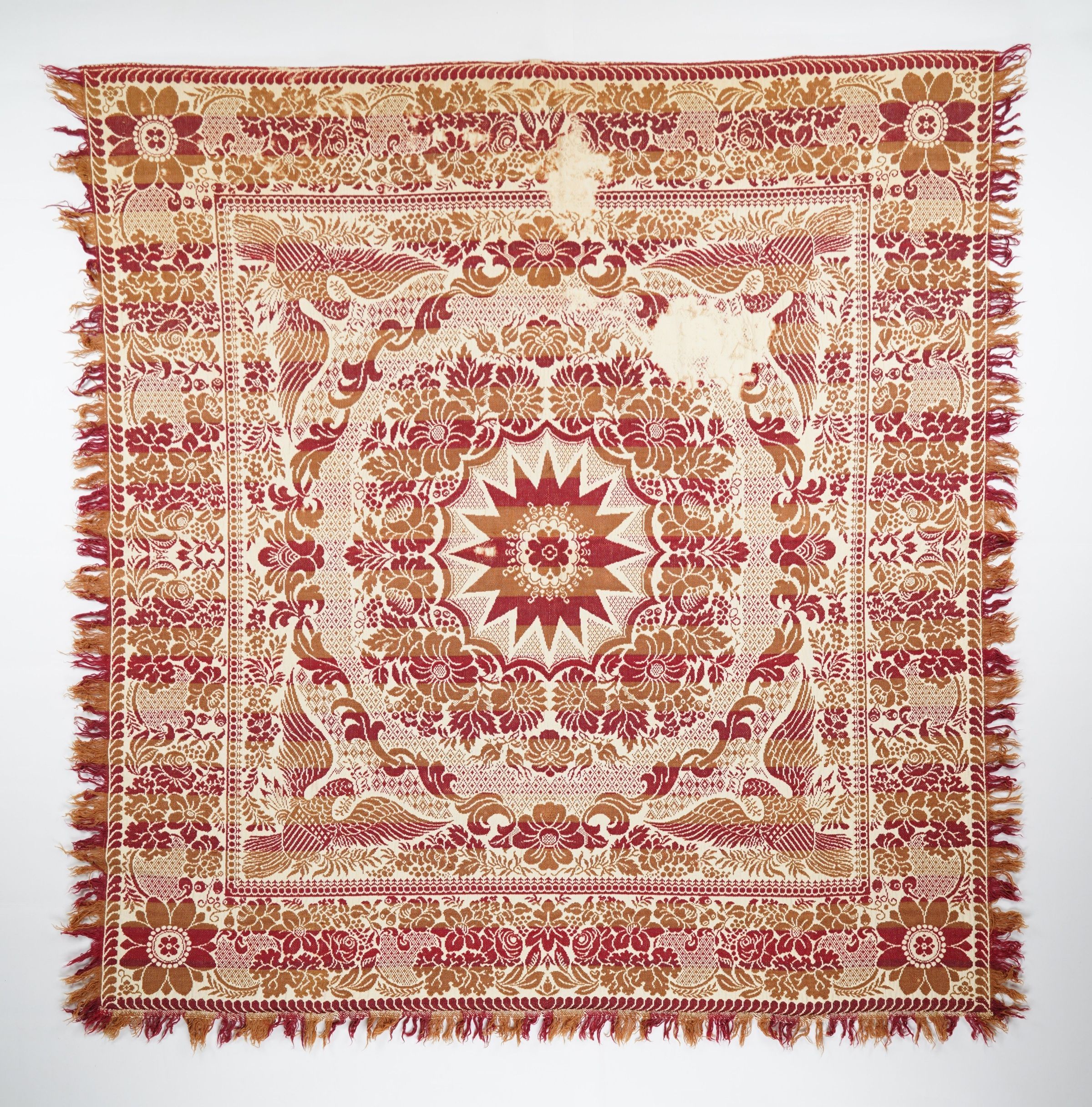 Red, orange, and natural figured tied beiderwand center medallions coverlet with fringe on three sides. Seamless.Context