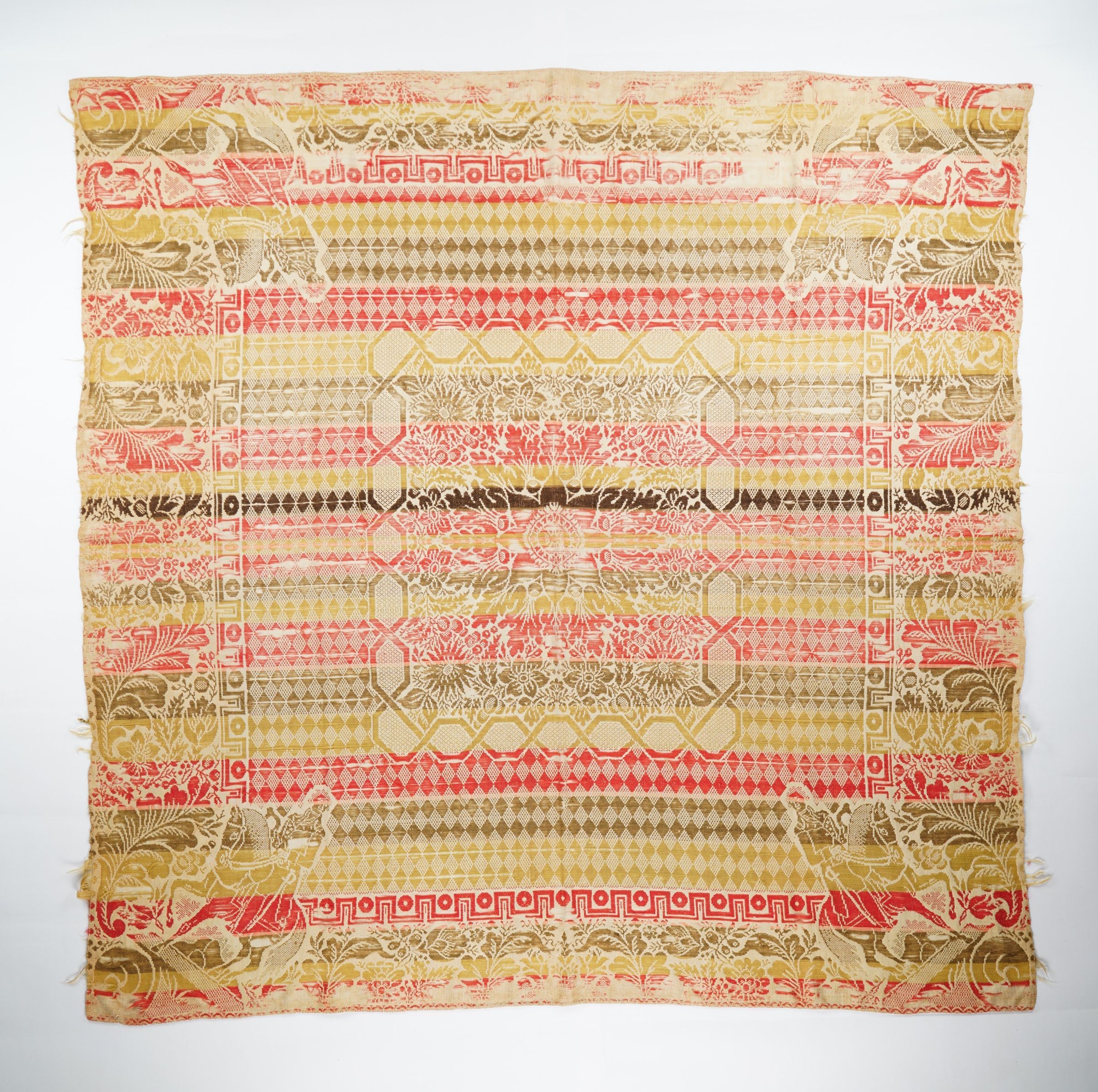 Red, yellow, green, brown, and natural figured tied beiderwand center medallion coverlet. Seamless. Features George Washington on horseback in each corner.Context