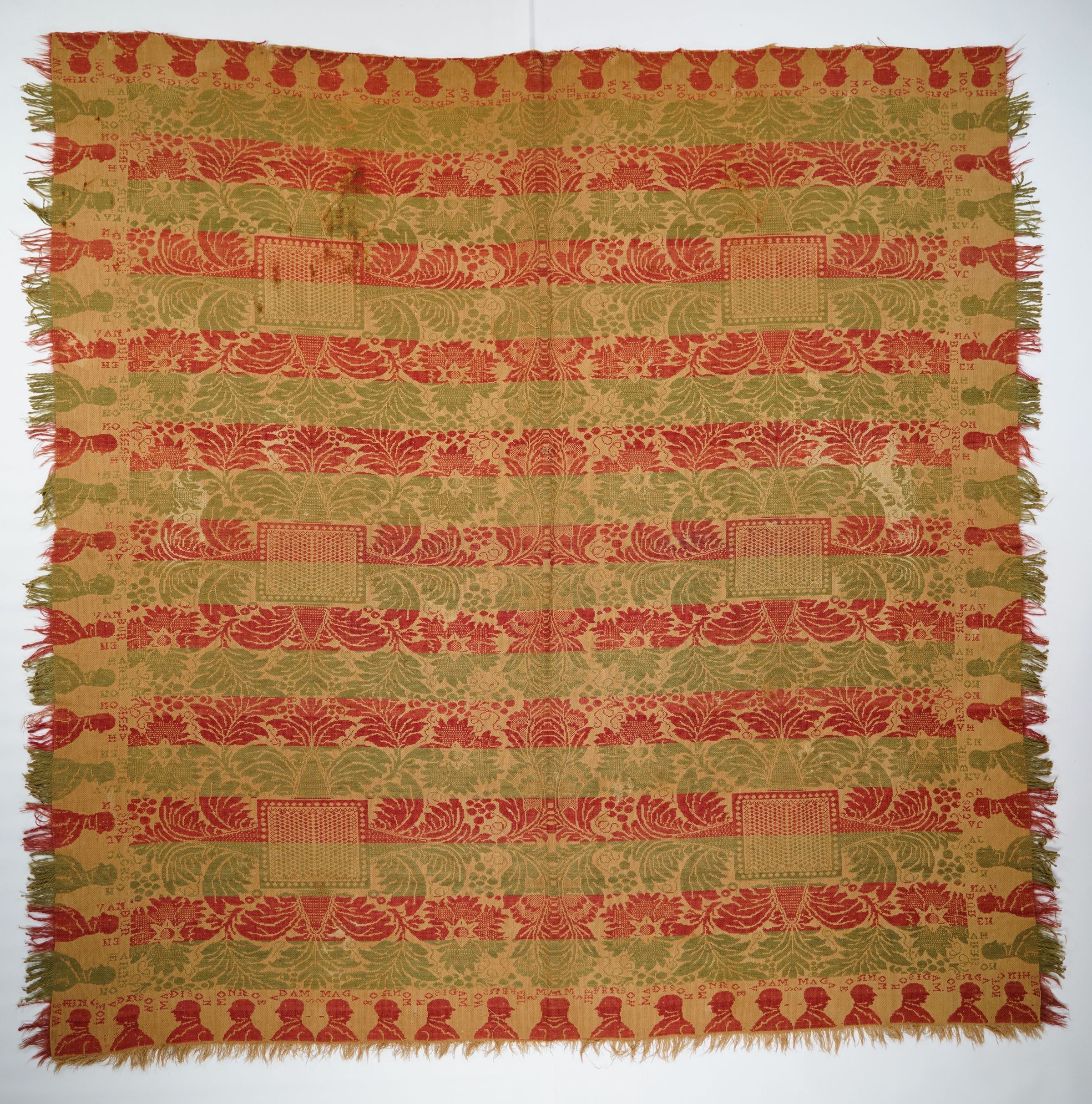 Red, green, and tan (natural) figured tied beiderwand coverlet with self-fringe on three sides and border of presidential profiles, naming the first nine presidents Washington, Adams, Jefferson, Madison, Monroe, (Adams), Jackson, Van Buren, Harrison. Centerfield with grapes and leaf fronds around dotted square medallions.Context