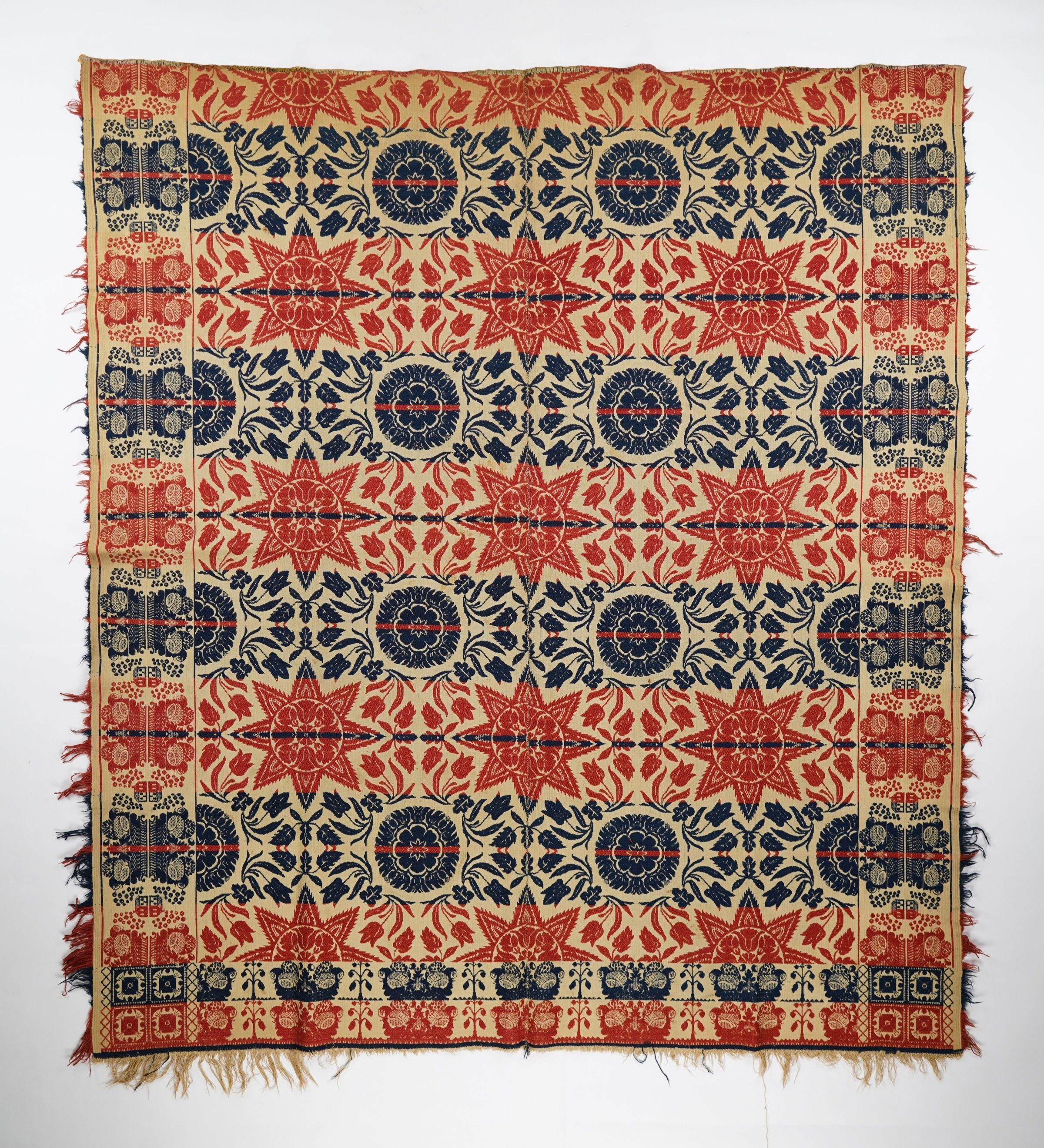 Figured and fancy tied beiderwand coverlet with borders on 3 sides and self-fringe on sides and bottom. Two panels joined by a center seam. Navy and red wool with undyed cotton. Floral star centerfield pattern; double ham border on sides and bottom. Unknown weaver with trademark of four abstract blocks.Context