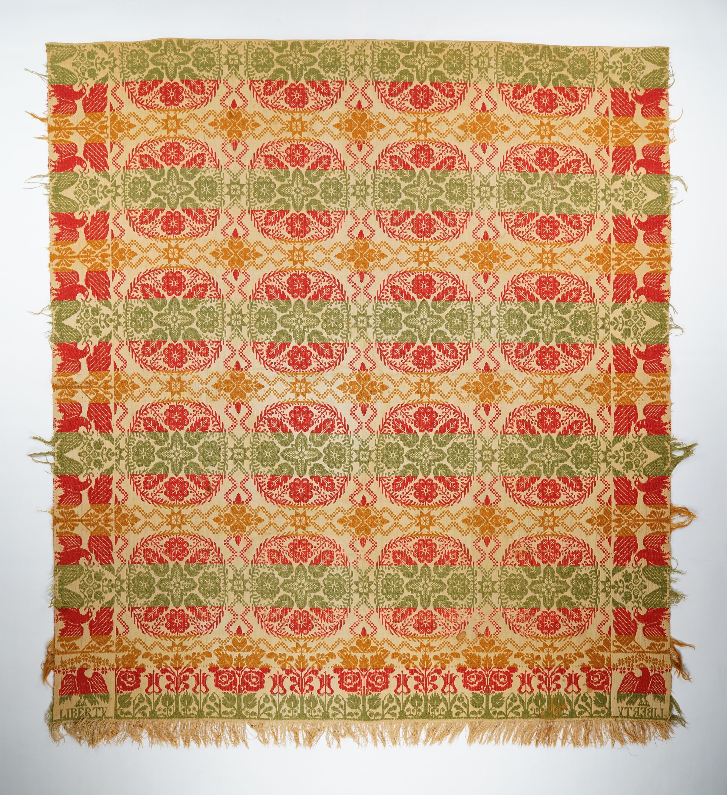 Figured and fancy tied beiderwand coverlet with borders on 3 sides and self-fringe on sides and bottom. Woven full-width; seamless. Red, yellow, and green wool with undyed cotton. Leafy medallion centerfield pattern; eagle border on sides; rose border on bottom. Unknown weaver with liberty eagle trademark.Context