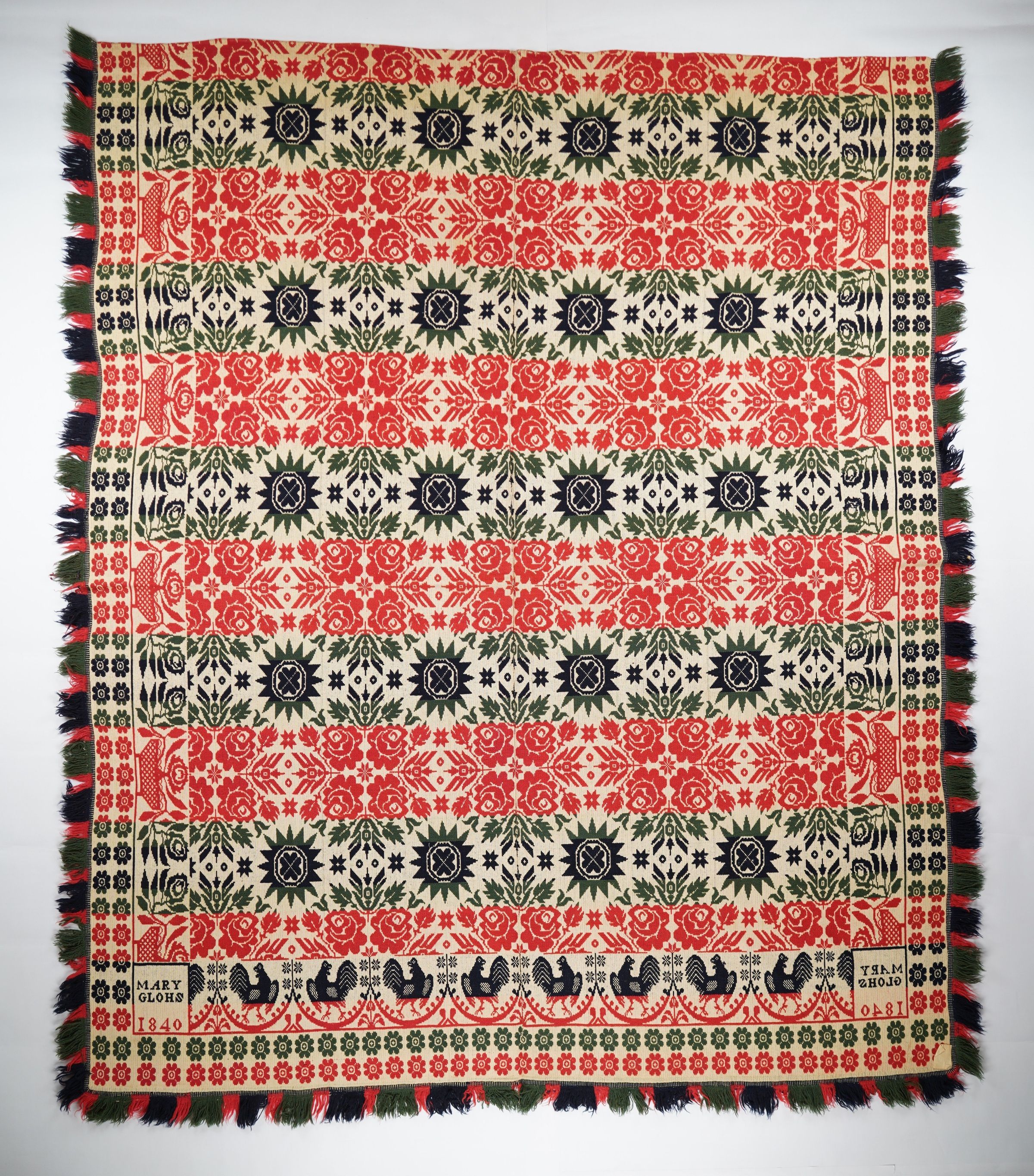 Red, green, navy, and natural figured tied beiderwand coverlet with border and applied fringe on three sides. Two joined panels. Woven for Mary Glohs in 1840.Context
