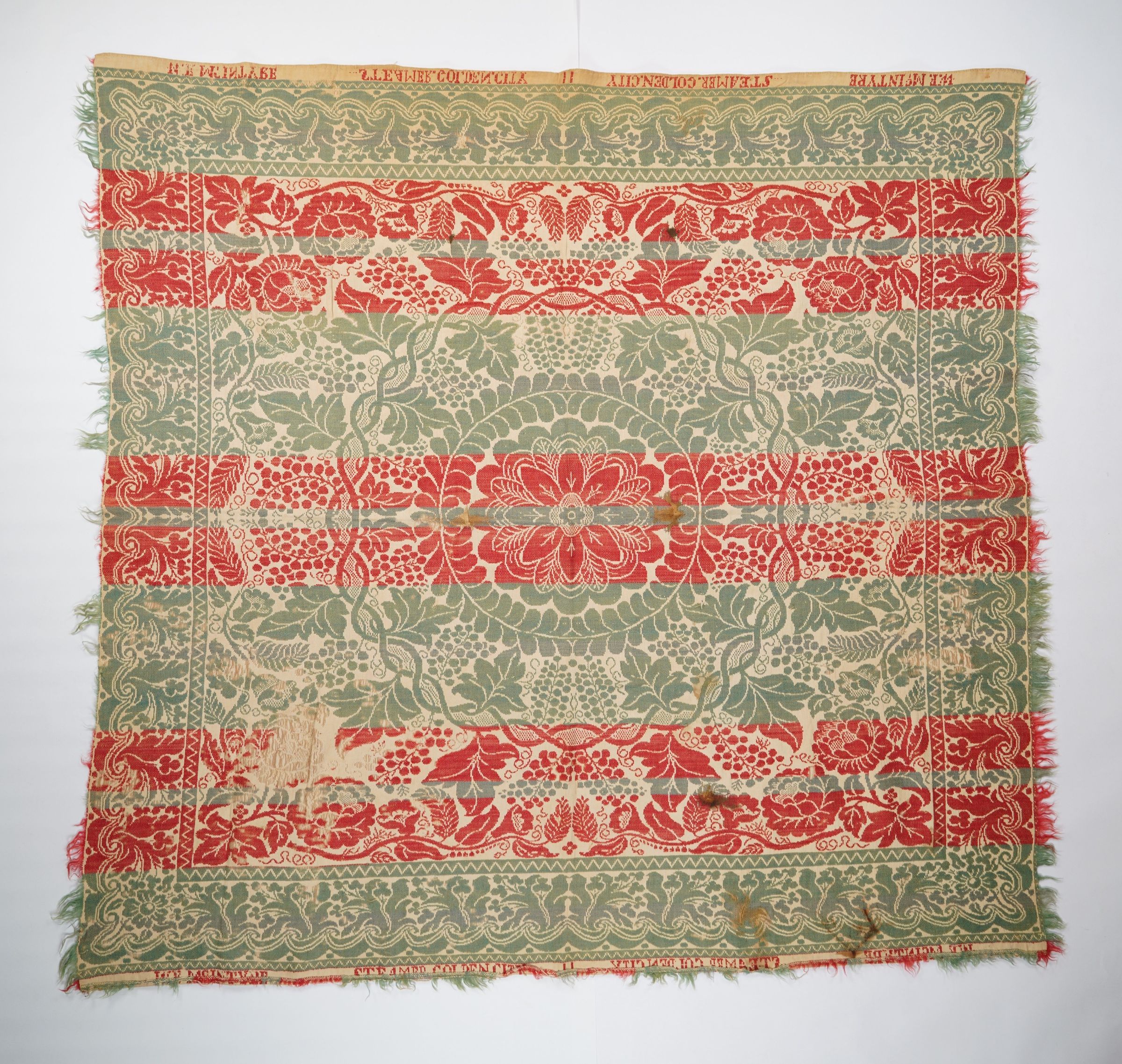 Red, green, and natural figured tied half doublecloth center medallion coverlet with fringe on three sides. Woven for W. F. McIntyre, First Clerk on the Golden City Steamer. The Golden City was a steamship that caught fire at Memphis, TN on March 30, 1882 at 4:30AM. 35 individuals died in its sinking. W. F. McIntyre was one of the survivors and a worker aboard the steamer. See New York Times, New York, NY 31 Mar 1882 and web links below.Collection