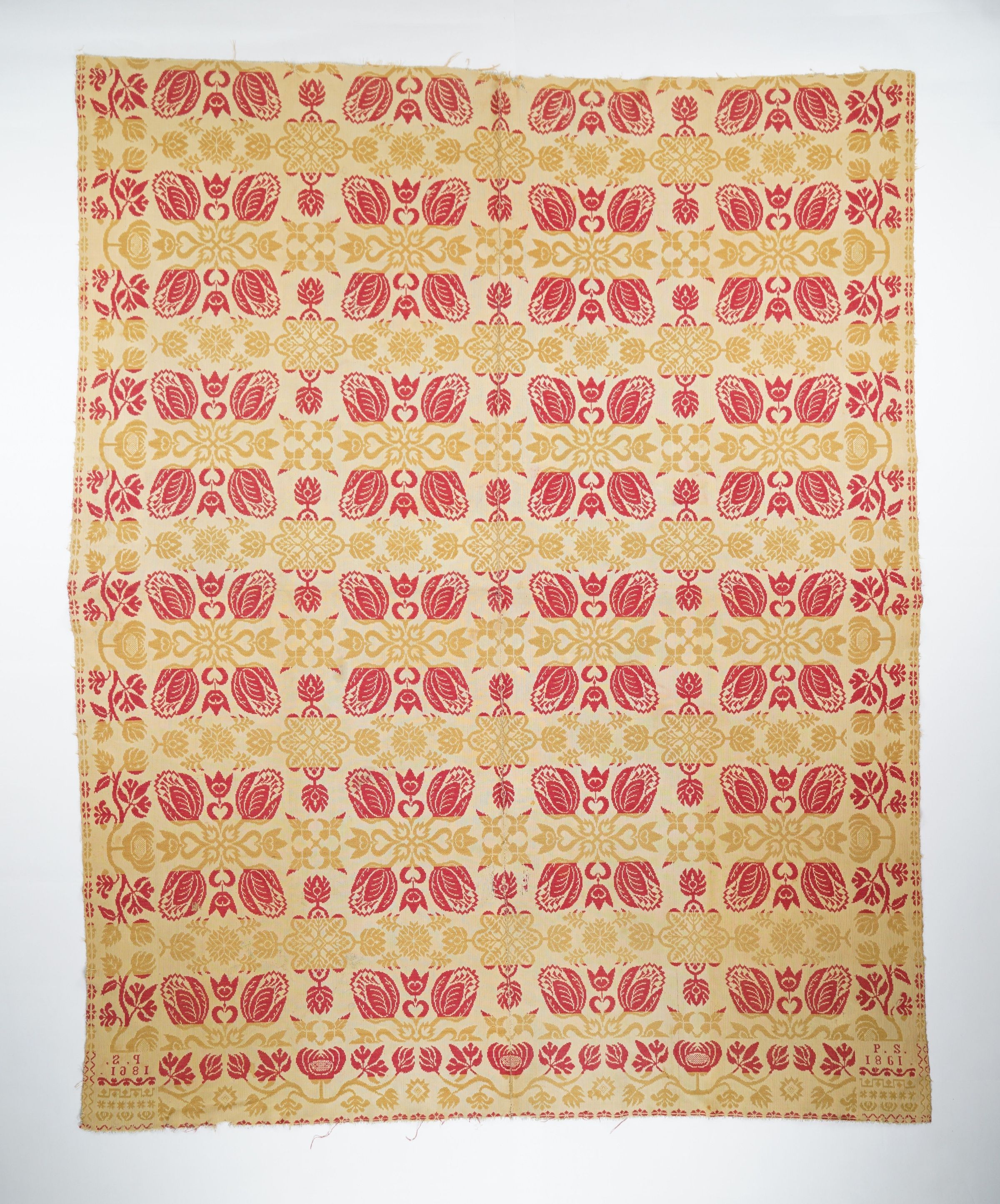 Yellow, red, and natural figured tied beiderwand coverlet with border on three sides. Two joined panels. Woven for P.S. in 1861.Context