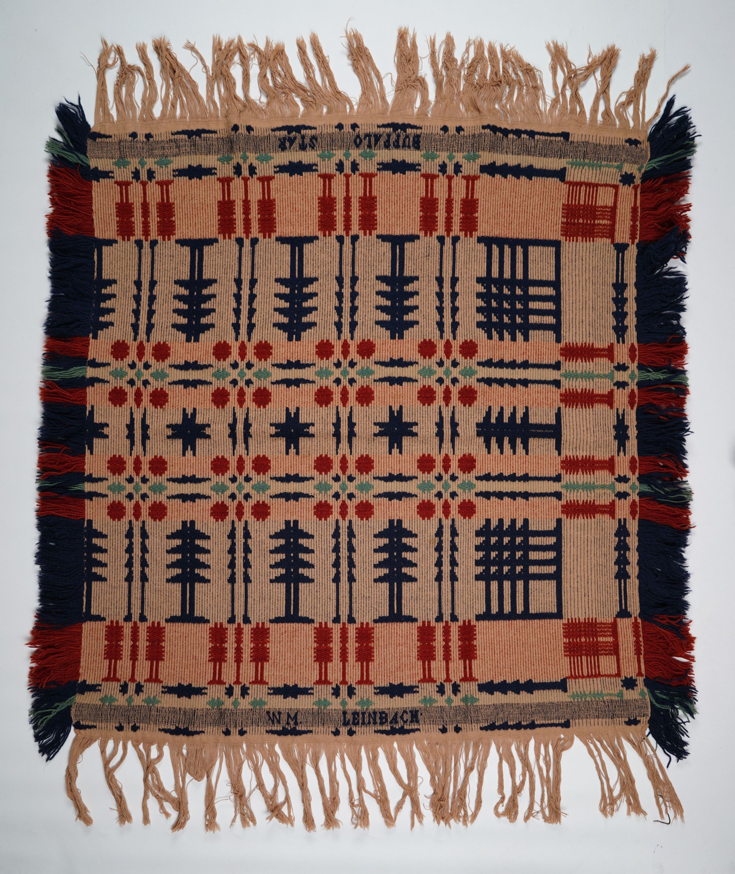 Blue, navy, red, and natural geometric tied half doublecloth crib coverlet with border on three sides and self-fringe on four sides. Woven by William Leinbach in Myerstown, Lebanon Co., Pennsylvania.Collection