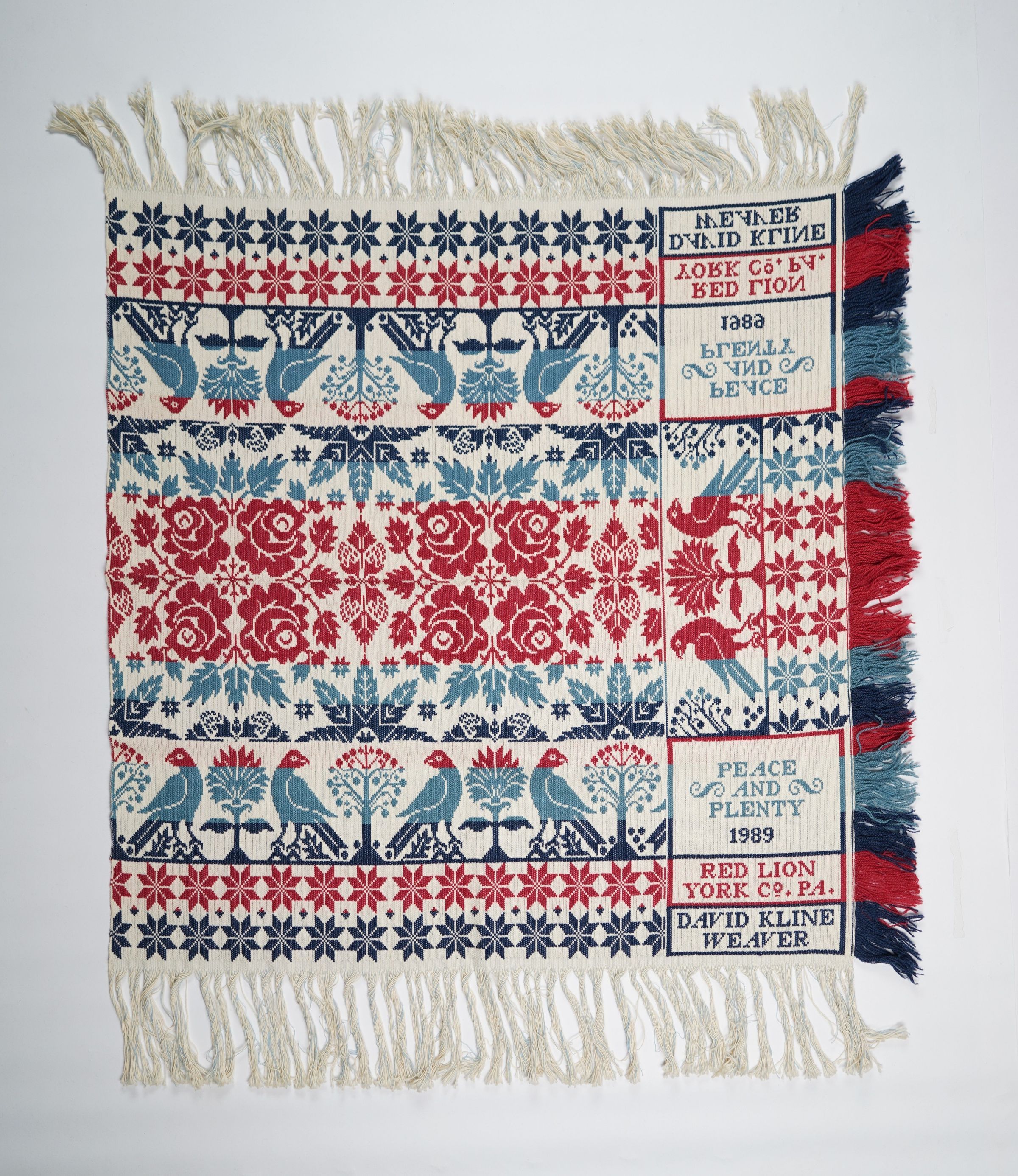 Blue, red, navy, and natural figured tied half doublecloth crib coverlet with border and self-fringe on three sides. Woven by David Kline in Red Lion, York Co., Pennsylvania in 1989.Collection