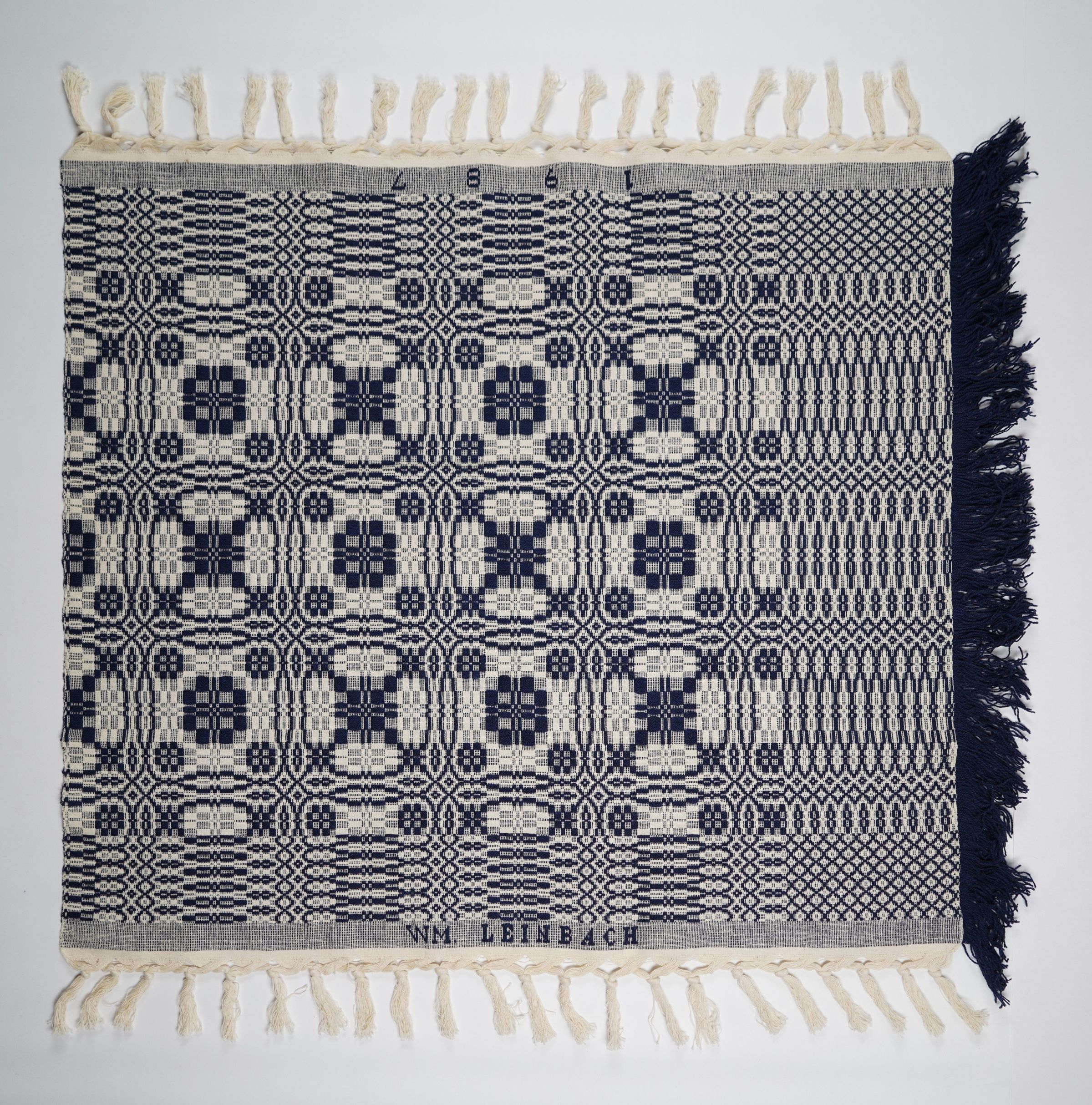 Navy and natural geometric overshot crib coverlet with border and self-fringe on three sides. Woven by William Leinbach in Myerstown, Lebanon Co., Pennsylvania in 1987.Collection