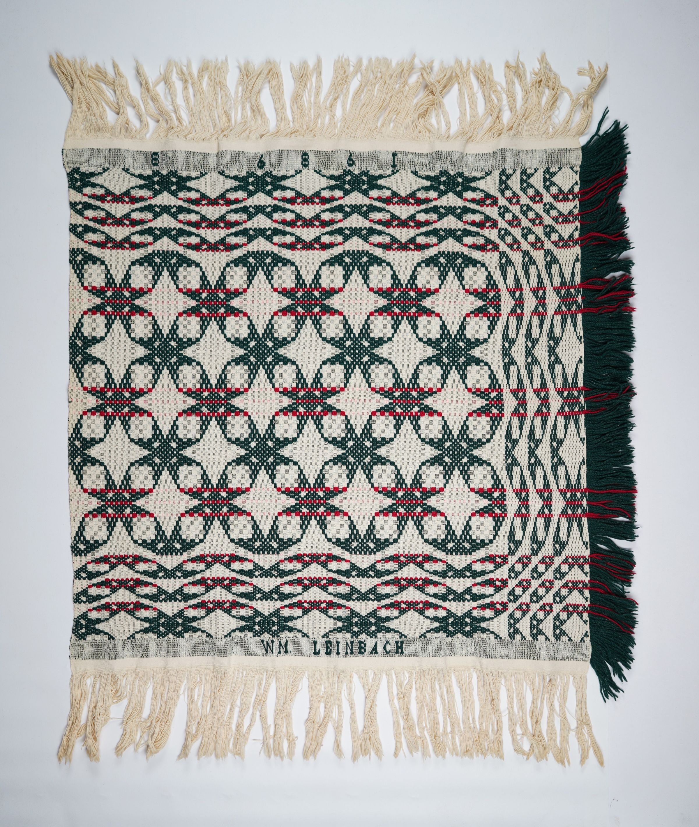Green, red, and natural geometric overshot crib coverlet with border and self-fringe on three sides. Woven by William Leinbach in Myerstown, Lebanon Co., Pennsylvania in 1989.Collection