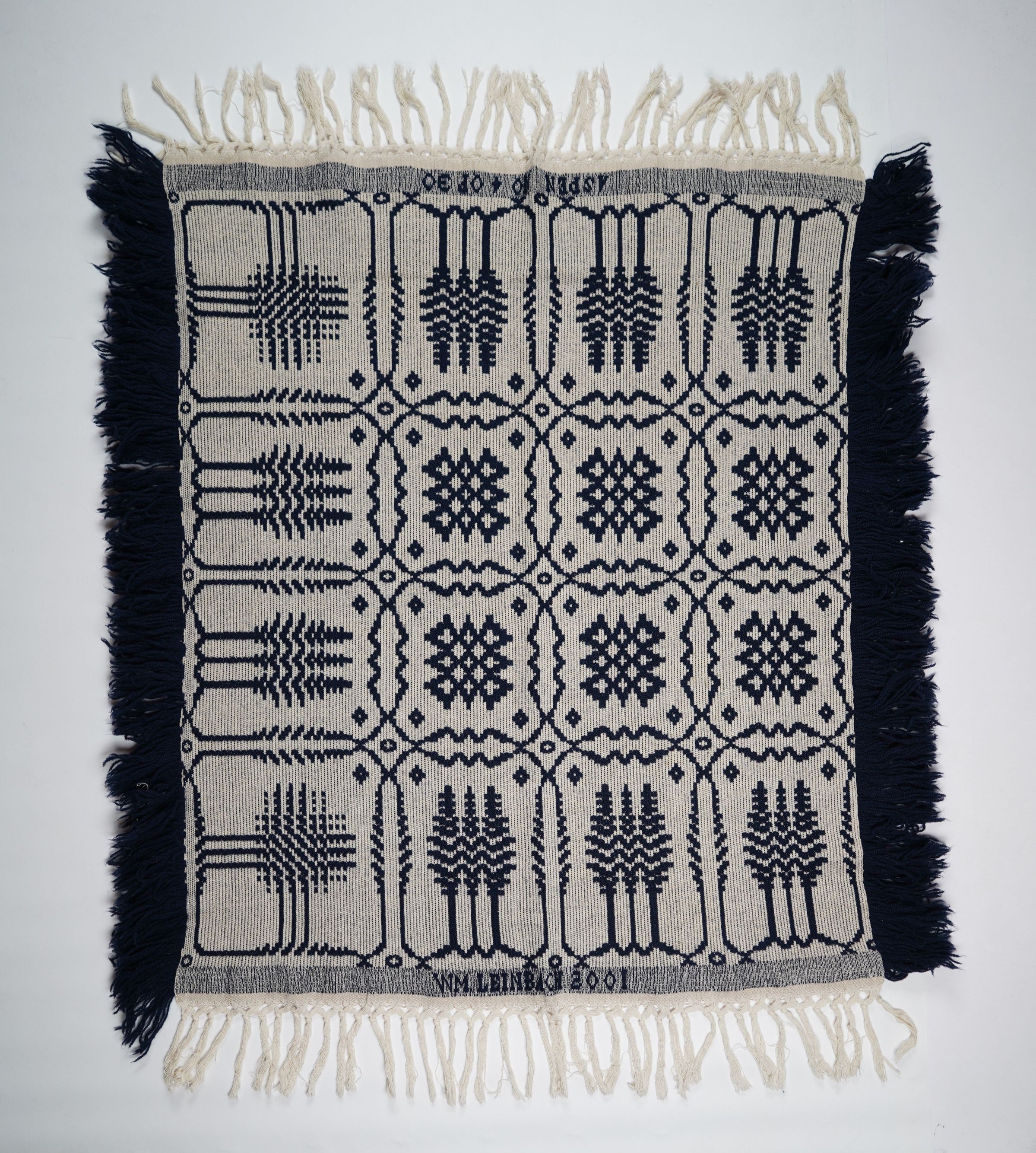 Navy and natural geometric tied half doublecloth crib coverlet with border on three sides and self-fringe on four sides. Woven by William Leinbach in Myerstown, Lebanon Co., Pennsylvania in 2001.Collection