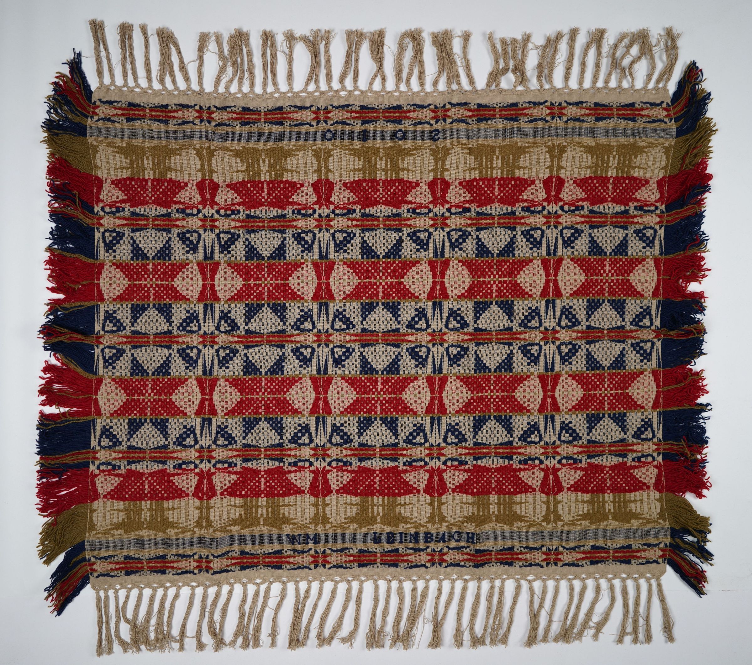 Yellow, red, navy, and natural geometric overshot crib coverlet with border on two sides and self-fringe on four sides. Woven by William Leinbach in Myerstown, Lebanon Co., Pennsylvania in 2010.Collection