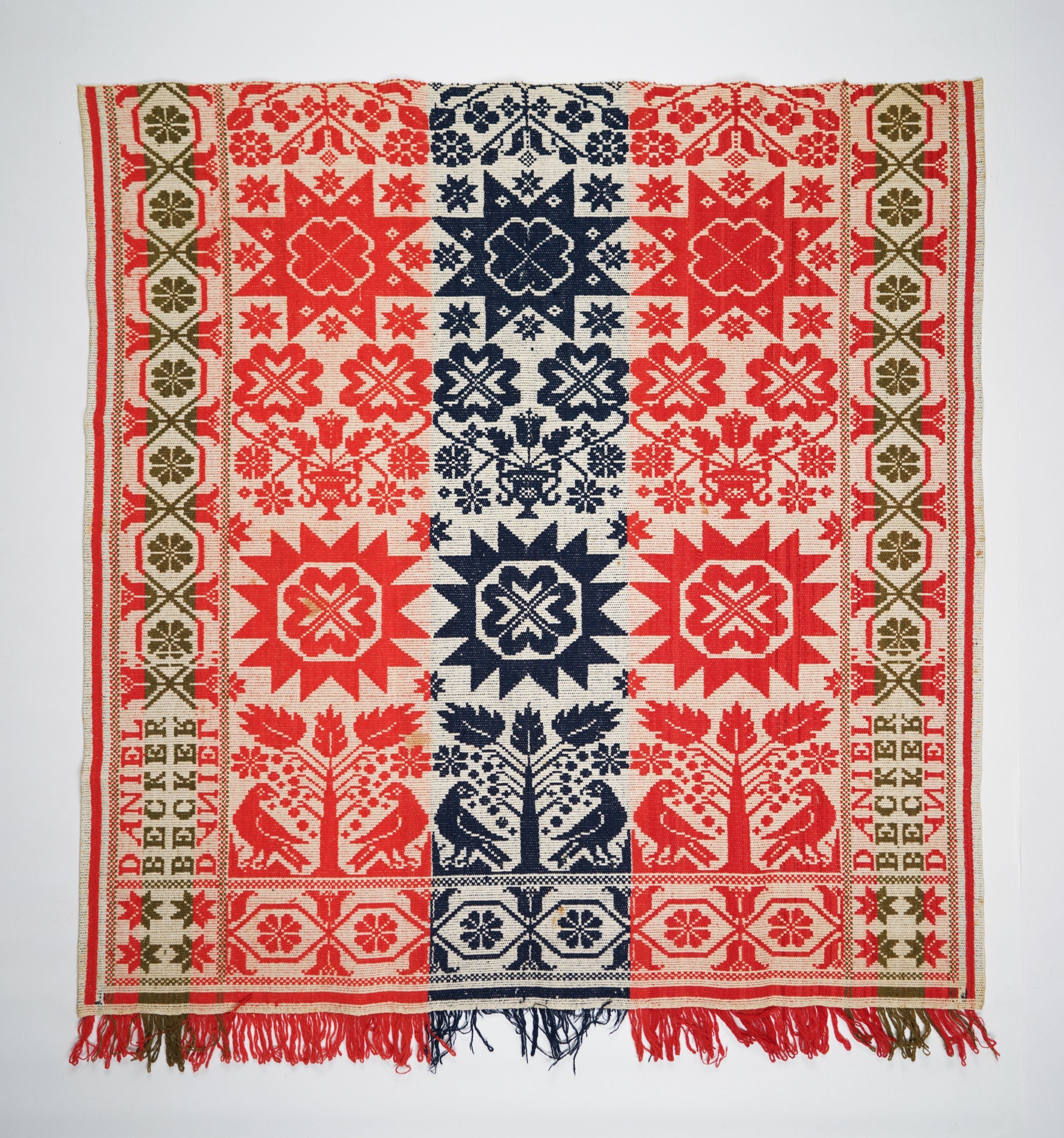 Red, green, navy, and natural figured tied half doublecloth crib coverlet with border on three sides and self-fringe along bottom. Woven by Daniel Becker.Collection