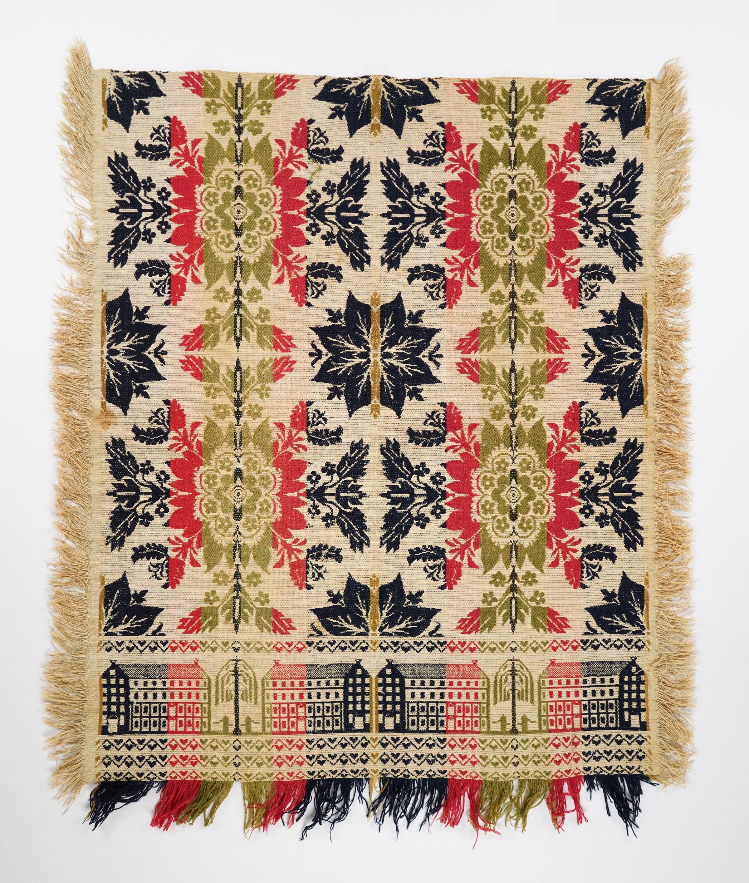 Figured and fancy tied beiderwand coverlet with borders on 1 side and applied fringe on sides and self-fringe on bottom. Woven full-width; seamless. Navy, green, gold, and red wool with undyed cotton. Floral centerfield pattern; building border on bottom. Unknown weaver.Context