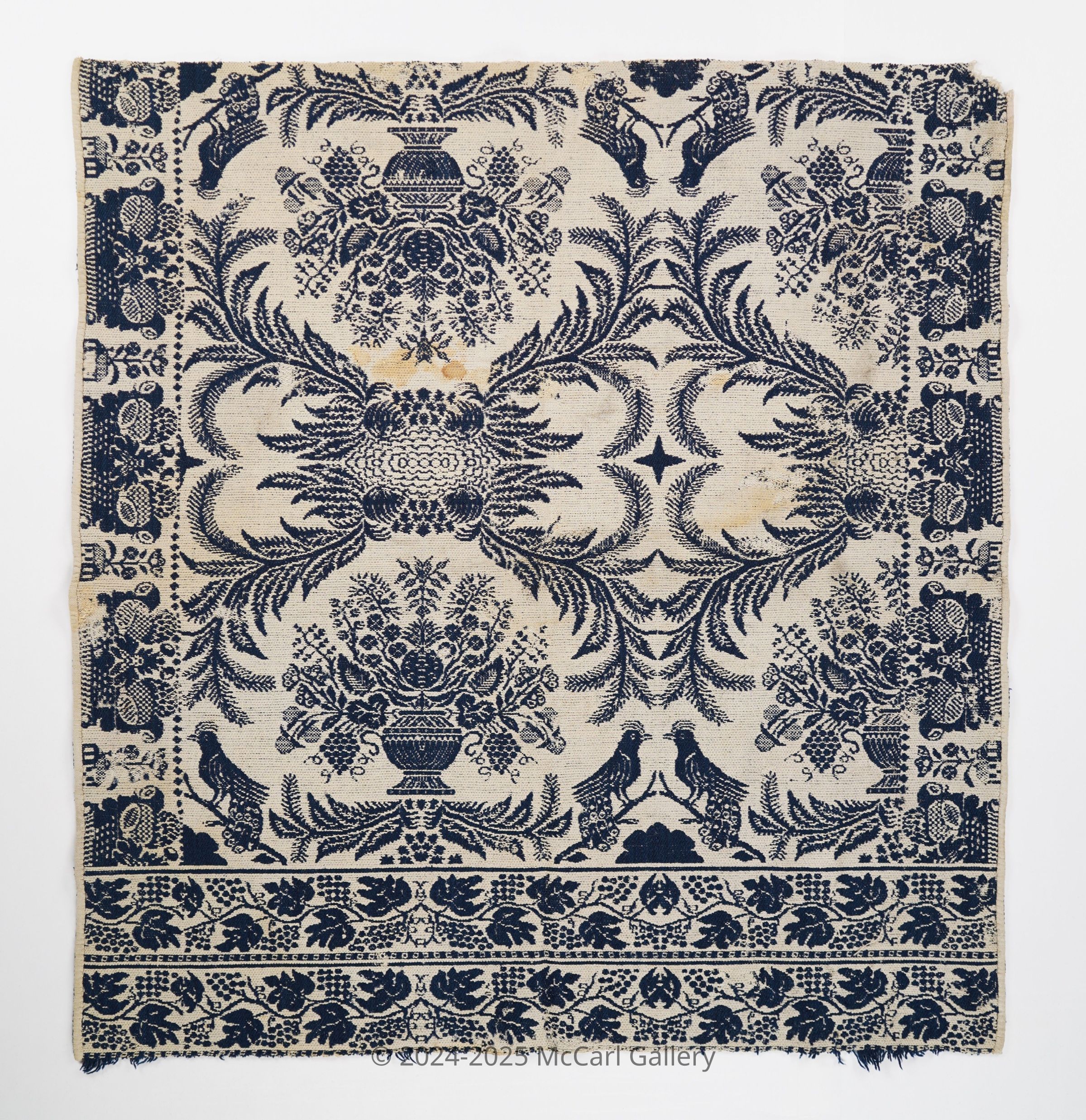 Figured and fancy tied beiderwand coverlet with borders on 3 sides and little self-fringe on bottom. Woven full-width; seamless. Navy wool with undyed cotton. Urn and bird centerfield pattern; floral and urn border on sides; grapevine double border on bottom. Unknown weaver.Collection