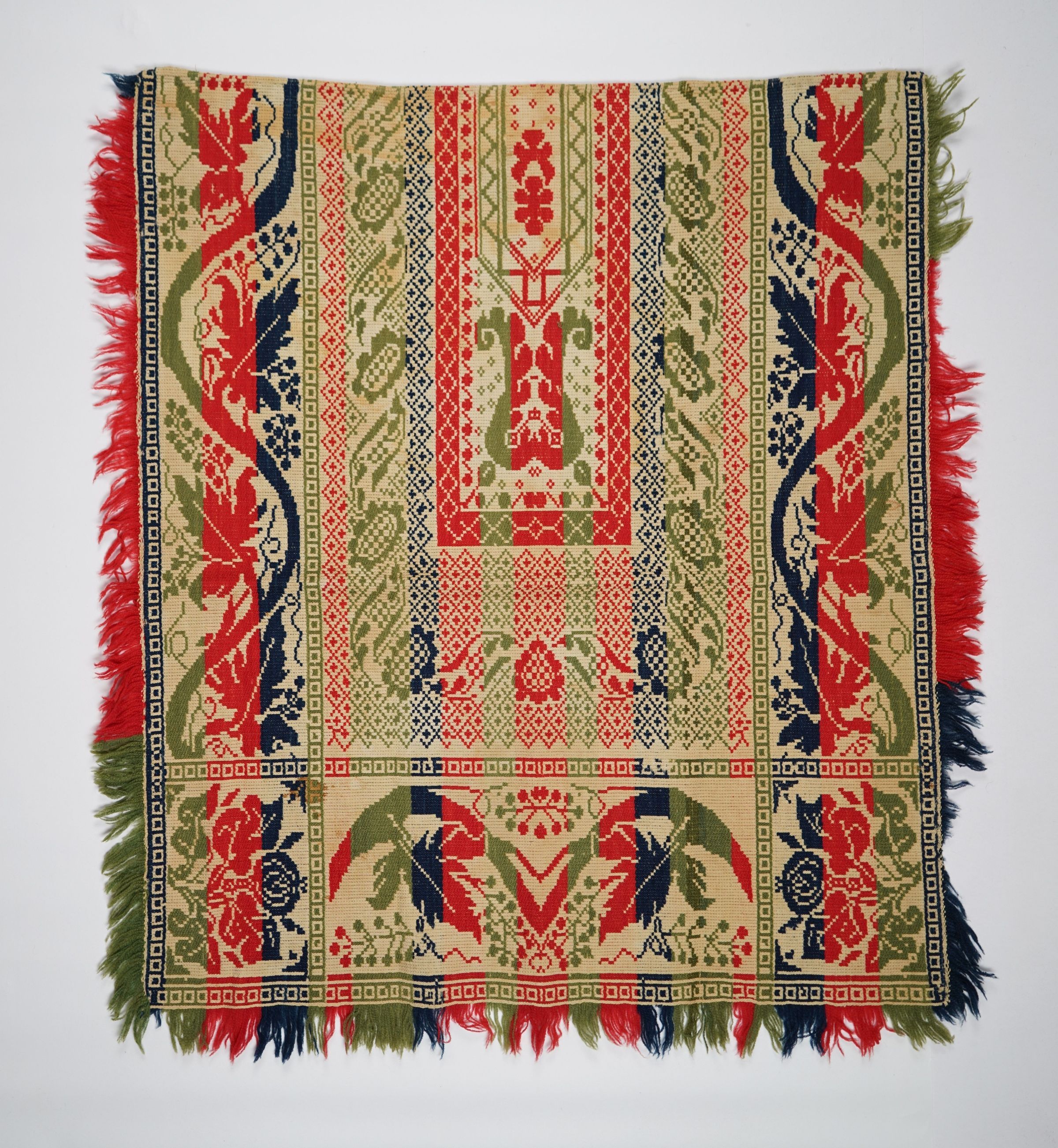 Green, red, navy, and natural figured tied half doublecloth crib coverlet with border and fringe on three sides.Collection