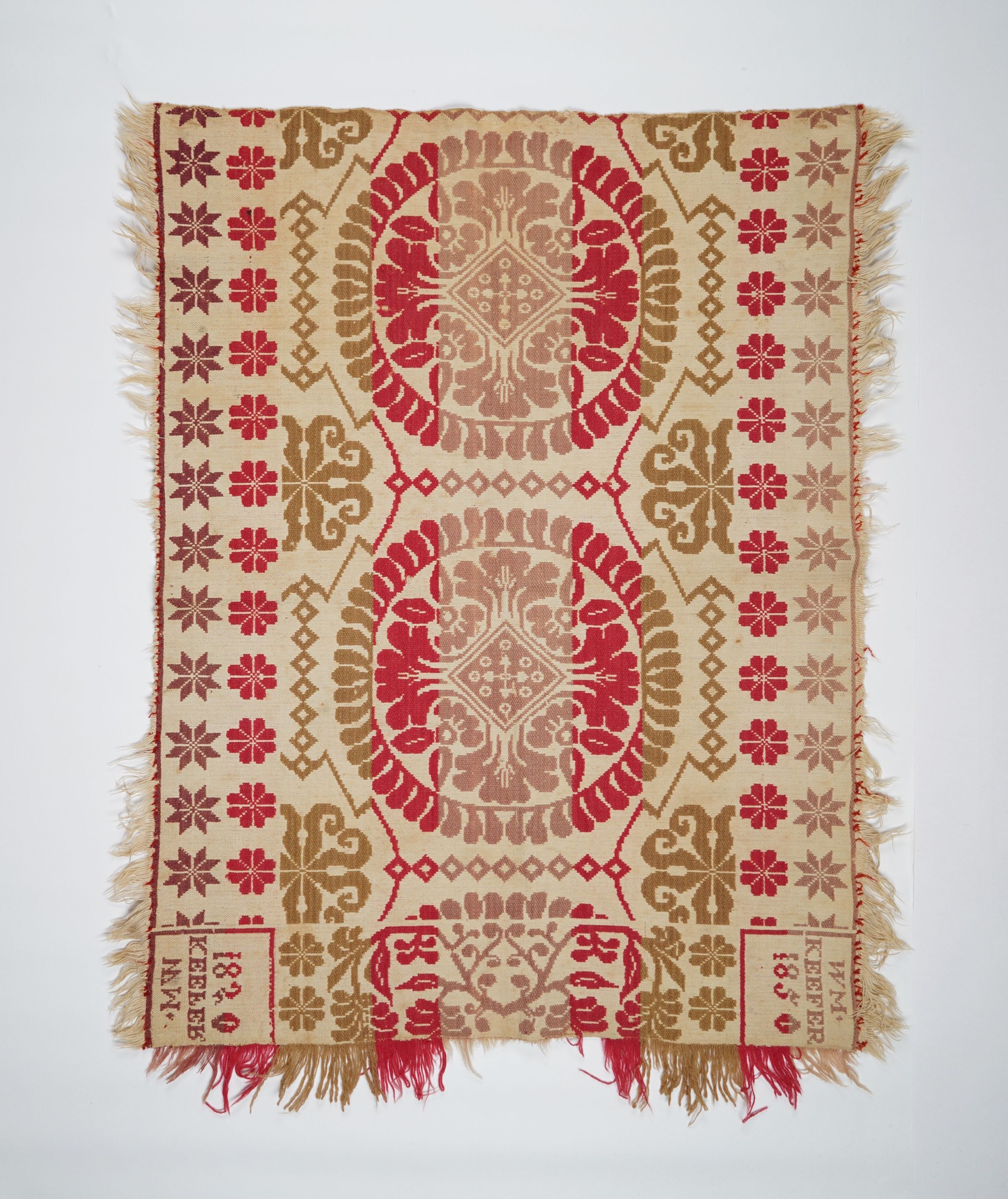 Yellow, purple, lavender, red, and natural figured half doublecloth crib coverlet with border and self-fringe on three sides. Woven by William Keefer in 1850.Collection