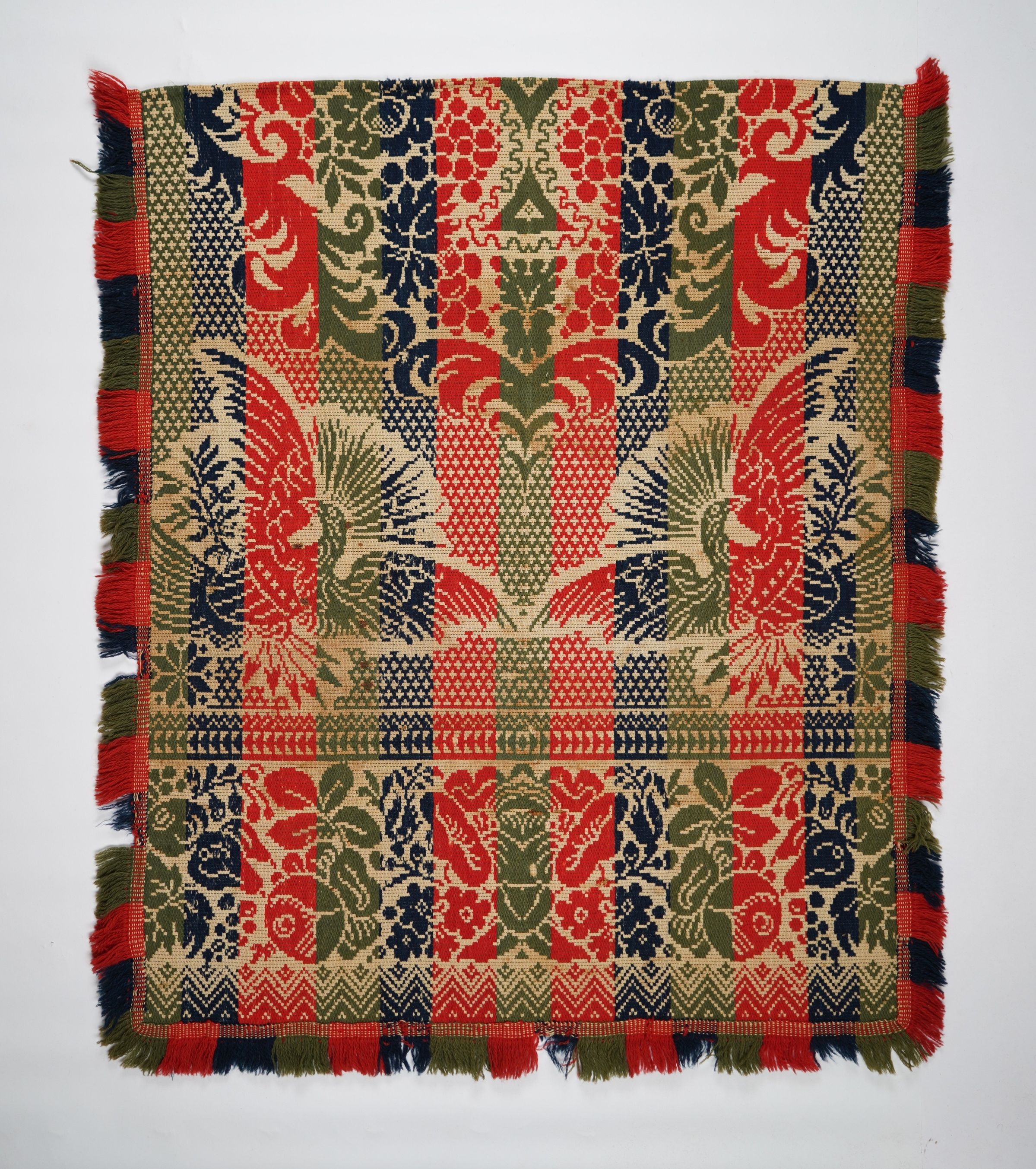 Red, green, navy, and natural figured tied half doublecloth crib coverlet with border along bottom and applied fringe on three sides.Collection