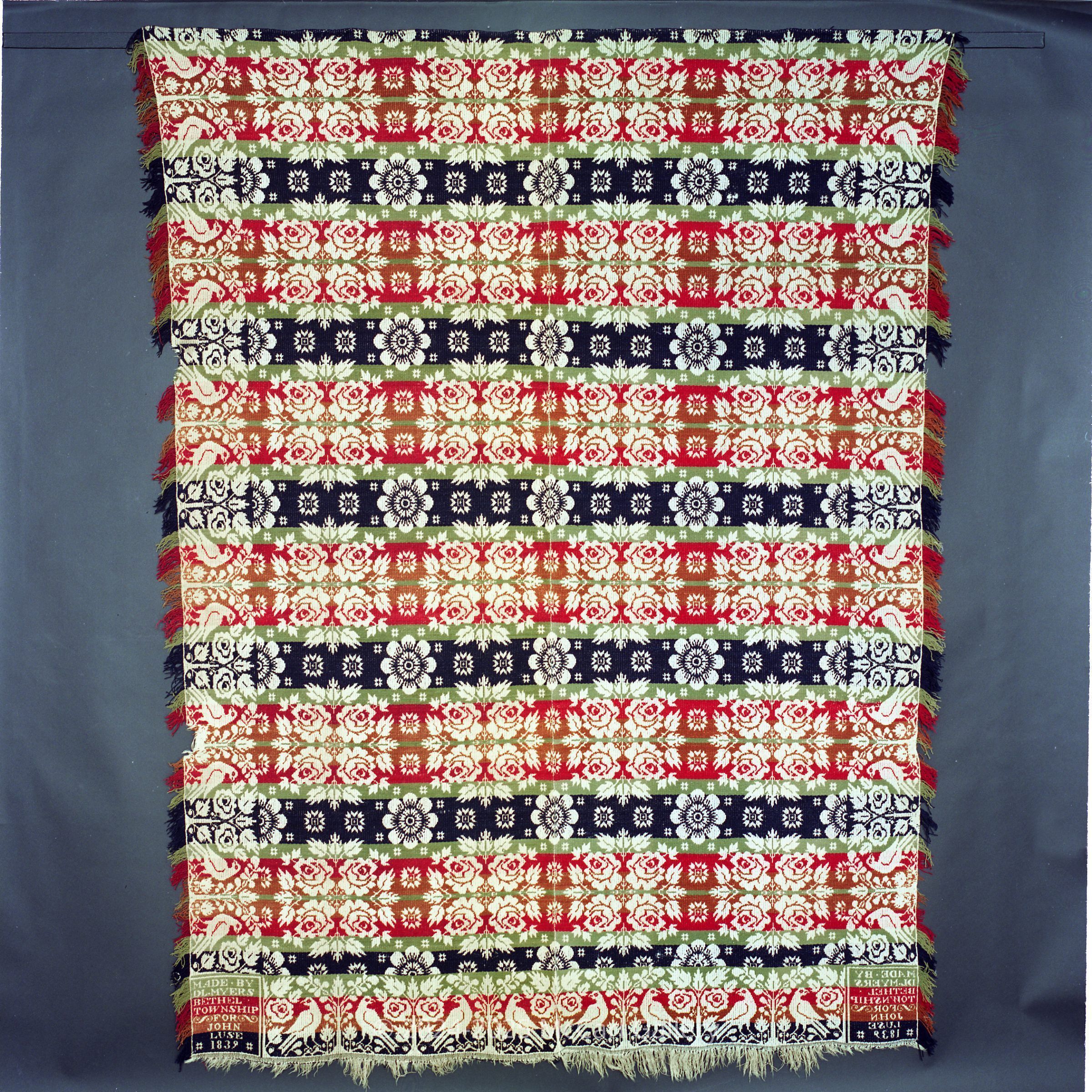 Beiderwand; navy, red, green, brown, natural; two loom widths joined; fringe on 3 sides; 2 blocks; border of distelfinks, roses, and leaves; centerfield contains rows of rosette clusters and other flowers and stars, strips of colorCollection
