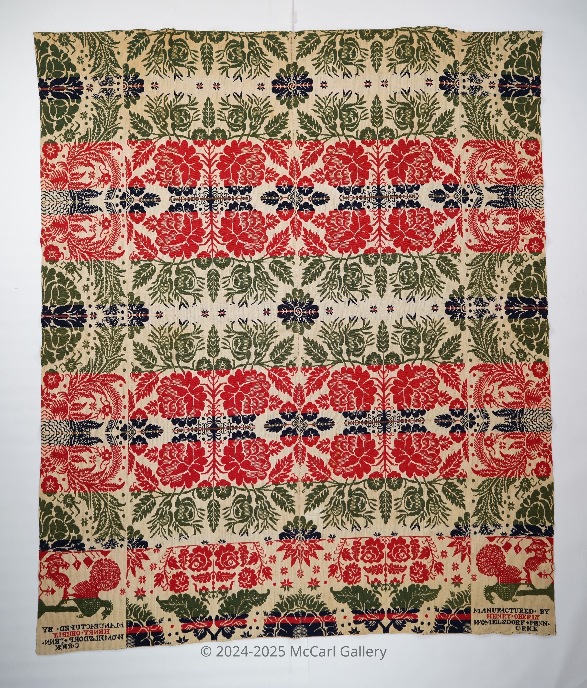 Red, green, navy, and natural figured tied half doublecloth coverlet with border on three sides. Two joined panels. Woven for C. Rick by Henry Oberly in Womelsdorf, Berks Co., Pennsylvania.Collection