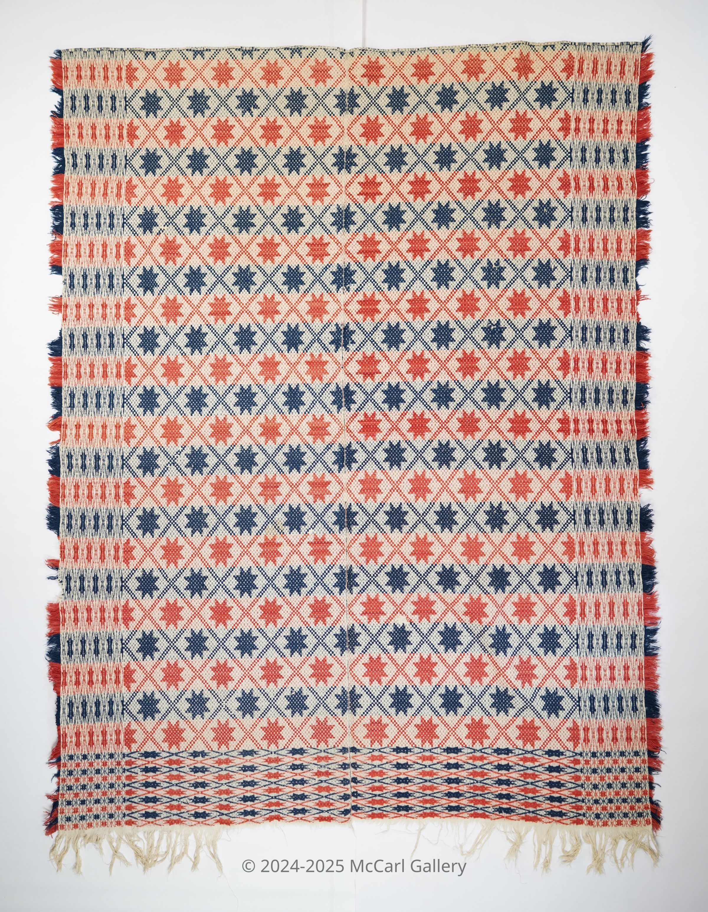 Red, navy, and natural geometric starwork coverlet with border and self-fringe on three sides. Two joined panels