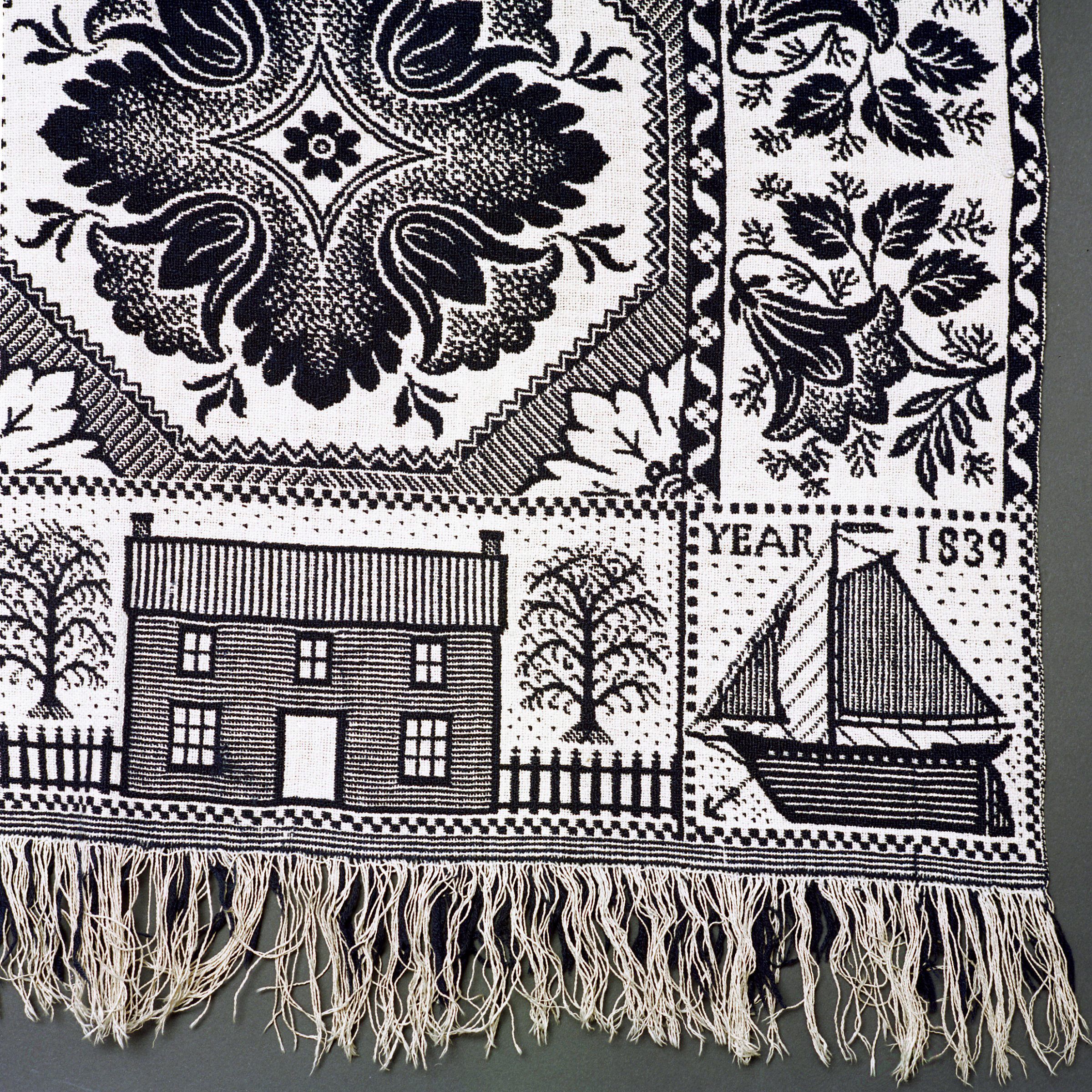 Double weave; navy, natural; two loom widths joined; fringe on one side; border on 3 sides; two long sides have lily like flower; bottom has houses with picket fence and tree in between; corner blocks have sailboat with anchor and inscription; centerfield of octagonal sections with large center of a flower inside; smaller flower between each sectionCollection