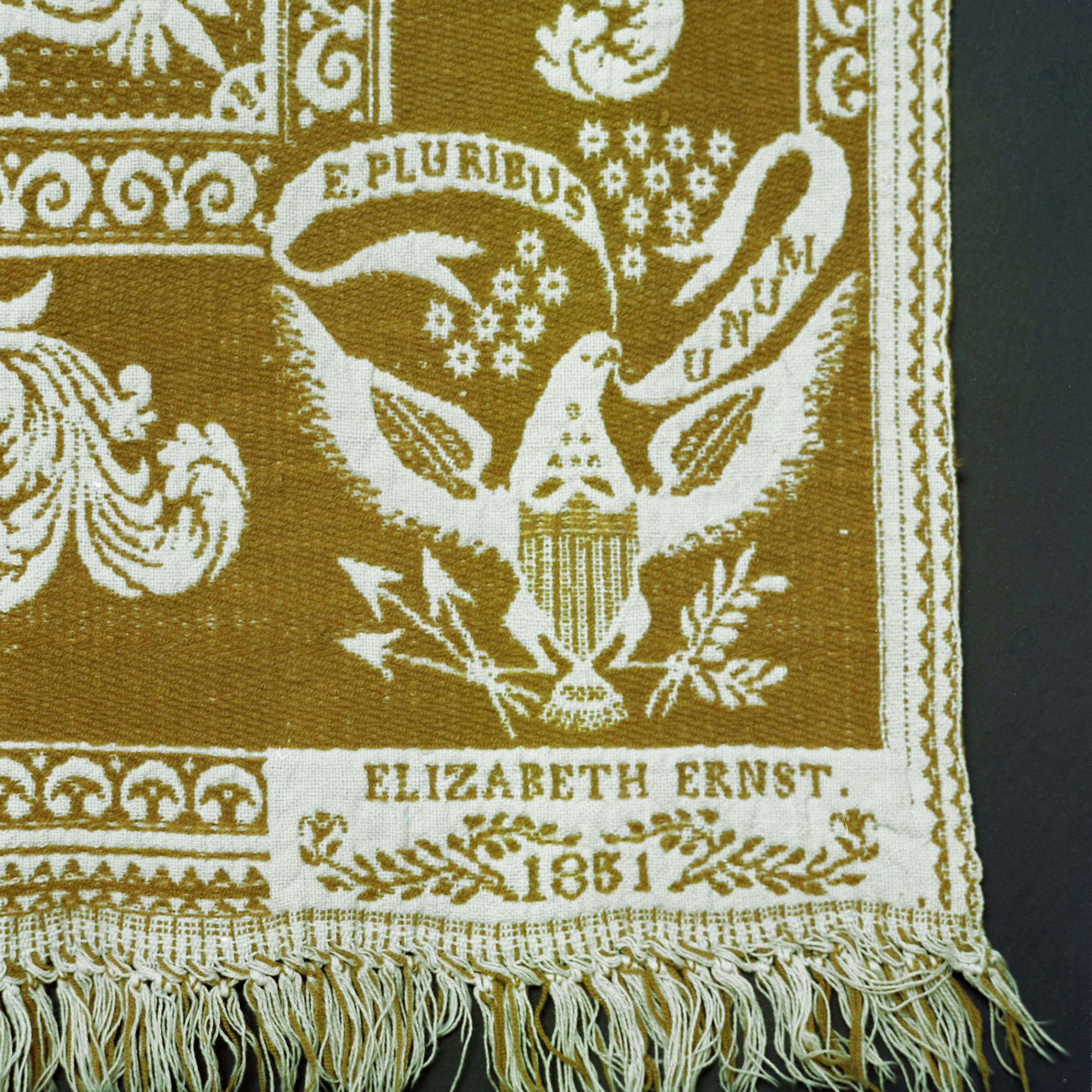 Beiderwand; gold, natural; two loom widths joined; fringe on one side; border on 3 sides; bottom border on larger scale, urns with feathers swirling from each side; 2 corner blocks with eagles with shield bodies holding wheat, arrows, and E P Unum banner; centerfield of pin dotted crosses; circular flowers surrounded by starsCollection