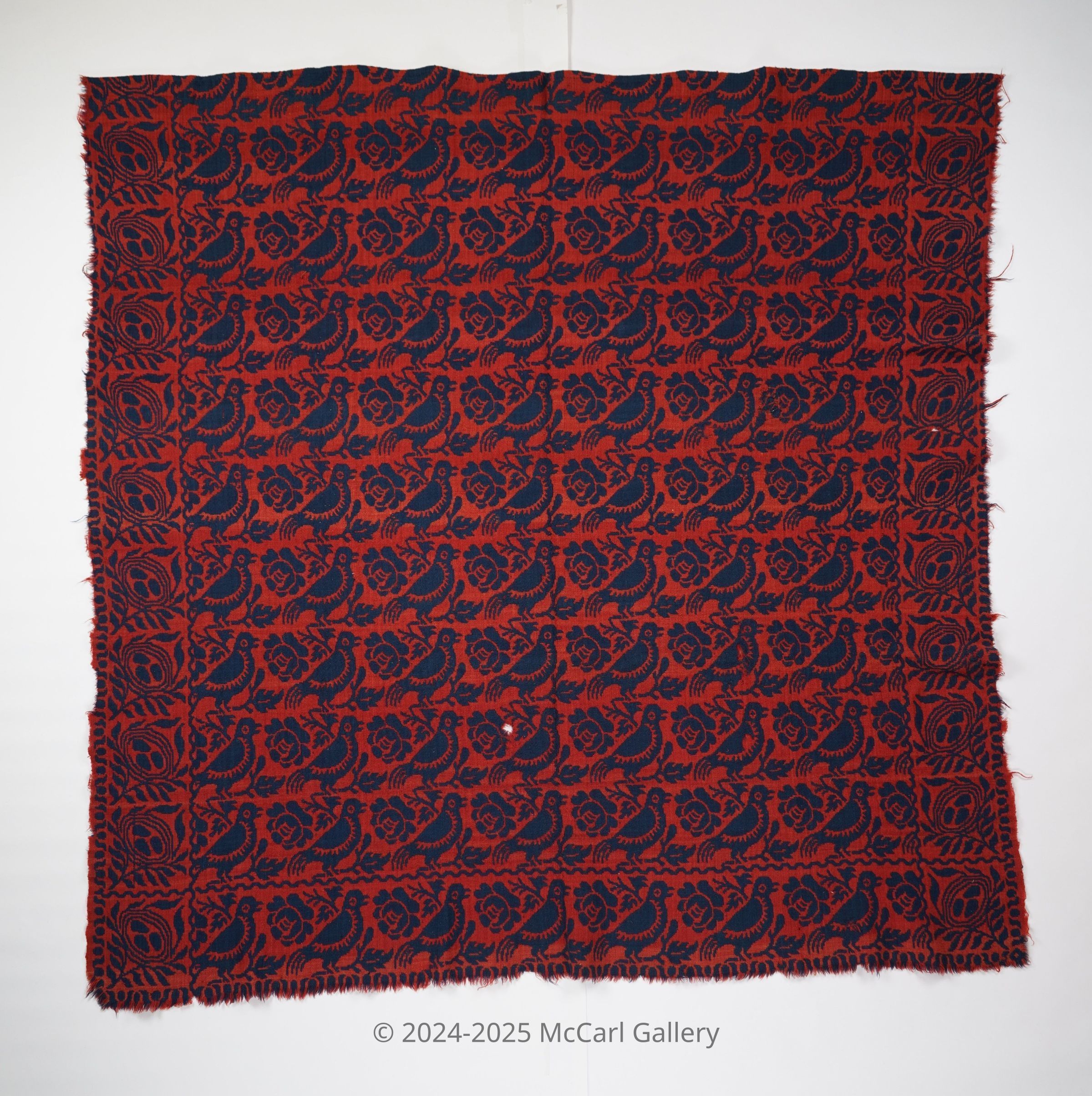 Red and navy figured double weave coverlet with border on three sides. Seamless.